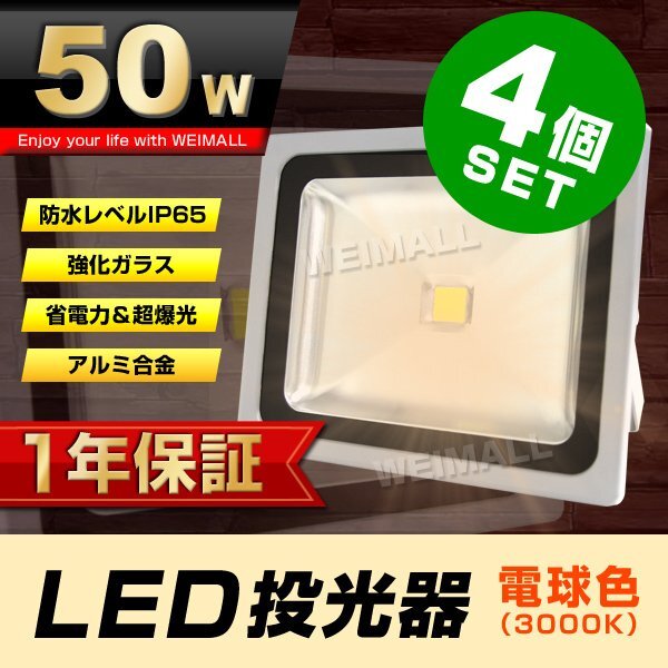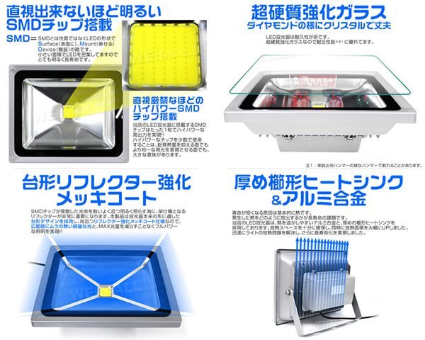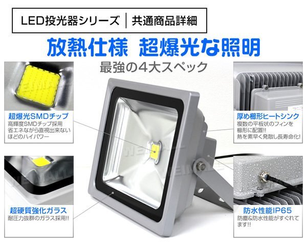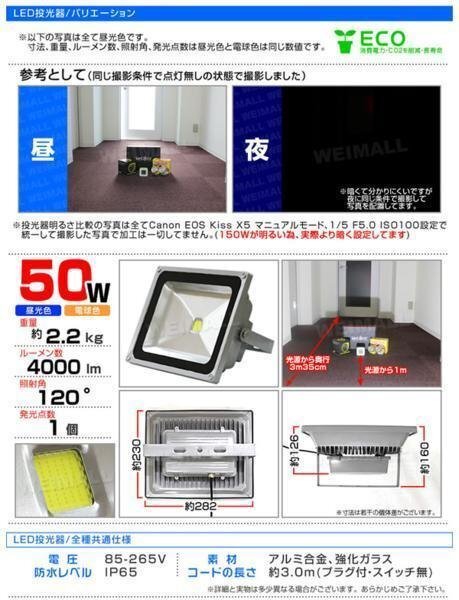 LED採用の省エネ投光器ライトです。 50Wと省電力で、従来の500W相当の明るさです。 IP65規格の防水仕様!ライトアップ照明に。 ホール、倉庫、町内の防犯灯など様々な用途に大活躍します! |