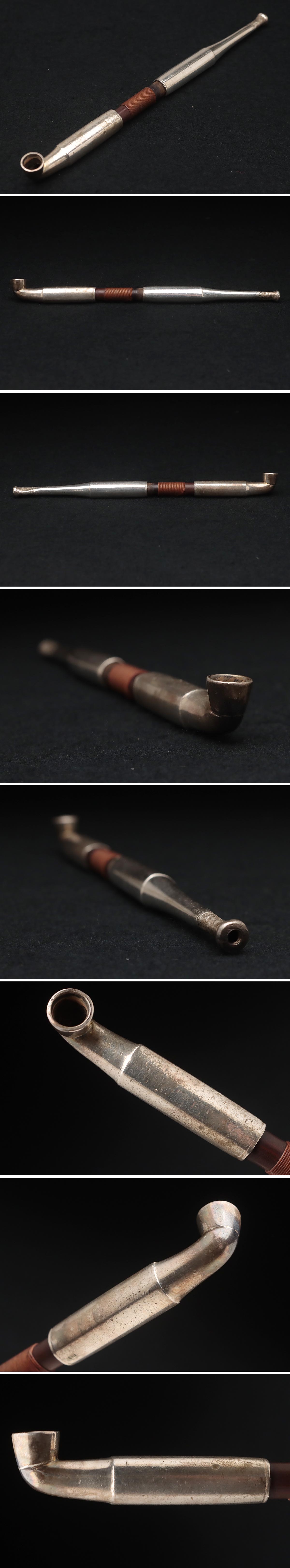 | ◆ 時代喫煙具 純銀煙管 全長17.5cm 竹羅宇含む重44g 純銀刻印・銀キセル・旱烟管 提げ物 古金工 古美術 ◆