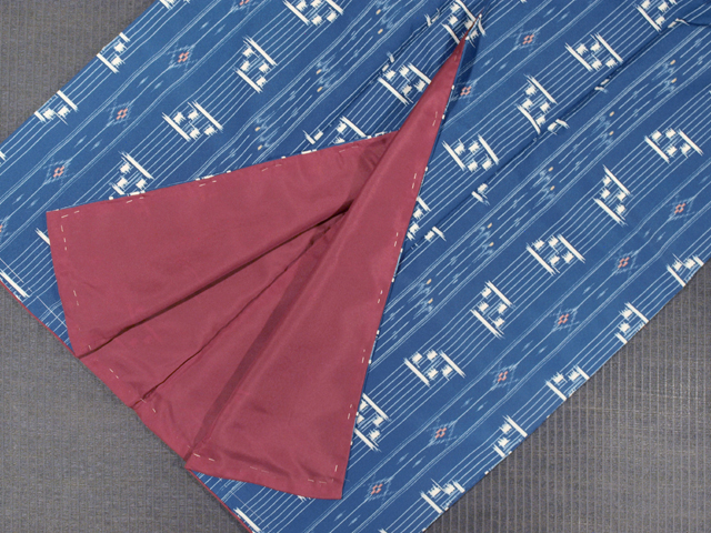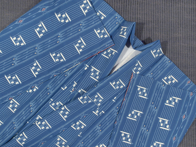 沈んだ藍色の地に、琉球絣調の文様が染められている、縮緬の洗える着物の小紋です。袷仕立てです。 さわやかな地色と文様のこまかな挿し色の砂色と桃花色、八掛の深く沈んだ紅(くれない)色のお色目が美しい印象です。洗える着物は 1 シーズンに 1 枚は持っておくと重宝します。お仕事でお着物をお召しになる方なら、なおさらですね。「日本製」と右衽裏のタグに表記されており、しっかりとしたお仕立てになっています。 しつけ付きの仕立て上がり未使用保管品で、しみやよごれ、褪色などのダメージもなく、新品同様です。 |