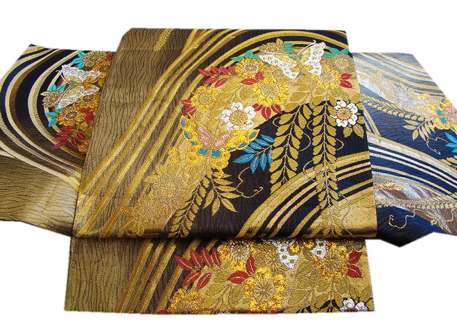 | 商品説明 | とてもしなやかで扱い易く〆易い重厚感溢れる西陣織の袋帯。 黒地に豪華な金糸や銀糸、赤紫、緑色等の蝶や花木柄の織柄。 六通柄。 ロング寸。 |