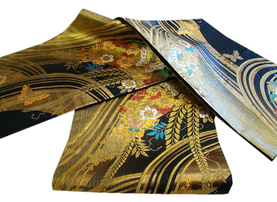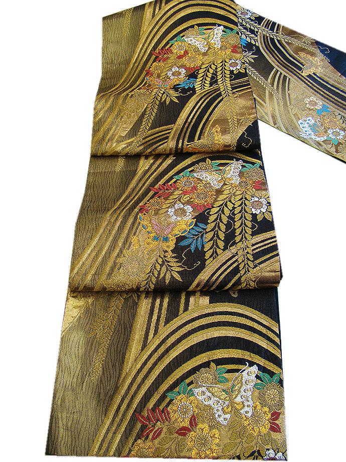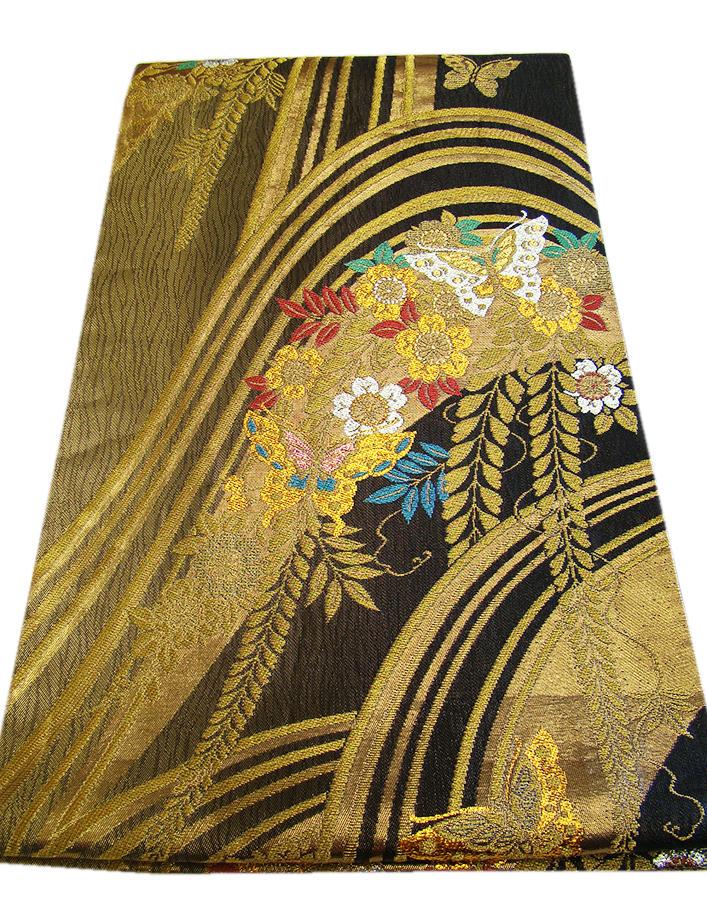 ★超大特価◆お振袖・訪問着等にピッタリ映える逸品!! 成人式を艶やかに彩る西陣織の黒地に蝶の華やかな袋帯(正絹) S210★ | |