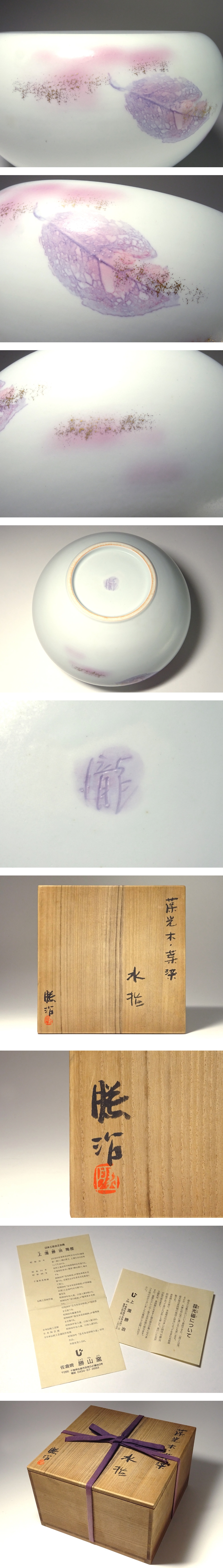 本物保証!       有田で代々続く瀧山窯の「上瀧与吉」を父に持ち「奥川忠右衛門」に師事した後、千葉県佐倉市で築窯し独立。さらに人間国宝「田村耕一」に師事し「葆光布染彩磁」(磁器の光沢のない、つや消しの技法)の研究を始め、日本工芸会正会員として数々の受賞歴や宮内庁・外務省・東京国立近代美術館などの買上を受ける名工【上瀧勝治】(1941-)作。