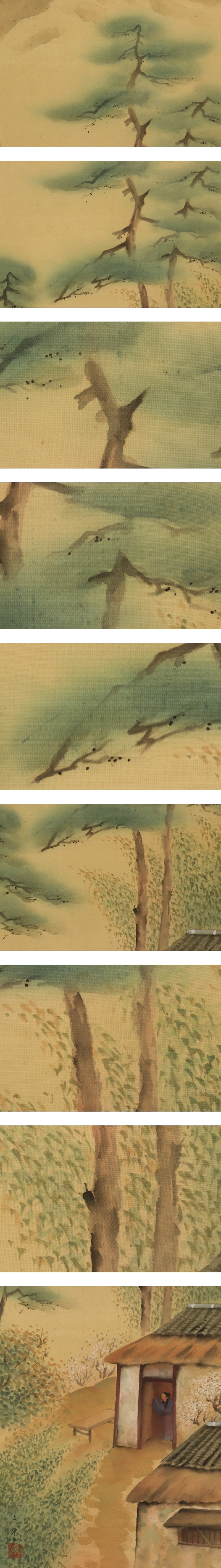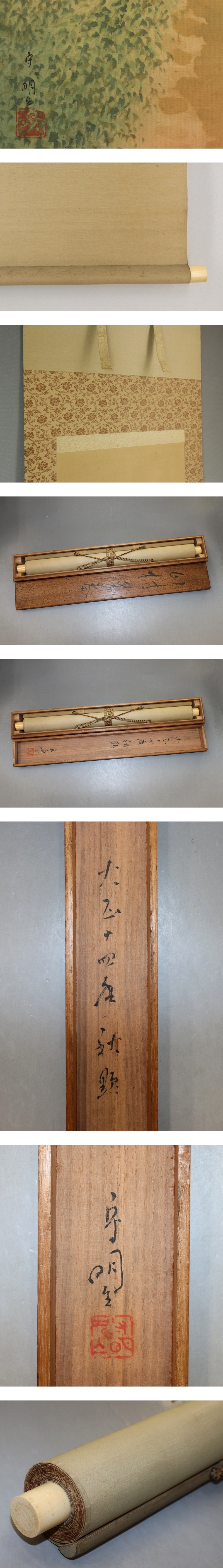 森守明 もり-しゅめい(1892-1951) 大正-昭和時代の日本画家。 明治25年6月17日生まれ。西山翠嶂の門下。 昭和2年「雨後」,5年「弘法大師」が帝展で特選。 師の画塾青甲社の中心作家として活躍した。 京都市立美術工芸学校,京都市立絵画専門学校(現京都市立芸大)で教える。 昭和26年7月11日死去。59歳。京都出身。京都市立絵画専門学校卒。 本紙は、染み、軽い皺、ヤケがあります。 表装は、染み、汚れ、折れ、皺、ヤケ、くすみ、軸先にヒビがあります。 【サイズ】 作品 横約35.5cm×縦約123cm 表装 横約48.5cm×縦約203cm |