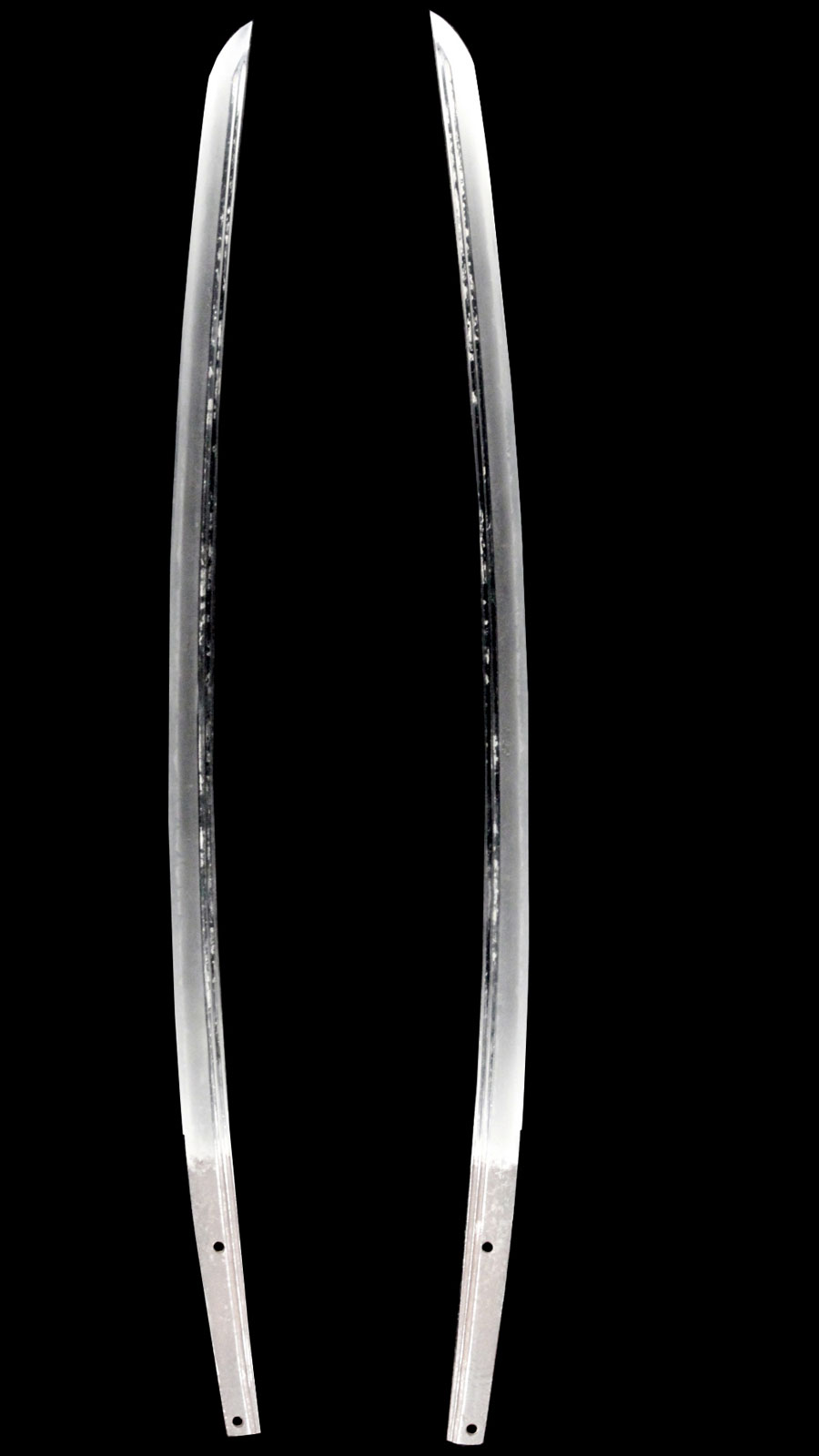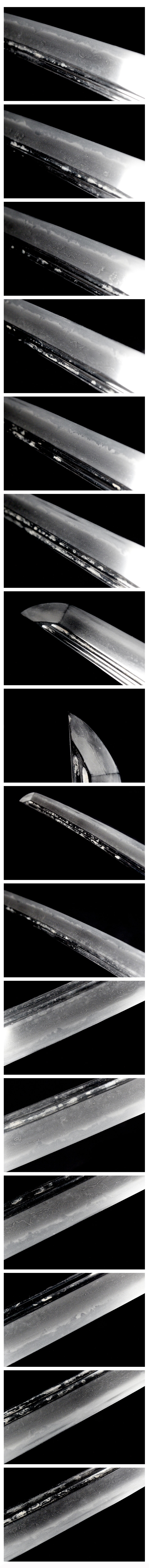 刀身長:約60.8cm 反り:約1.4cm 目くぎ穴:2個 元幅:約26.7mm 元重:約6.2mm 先幅:約20.4mm 先重:約4.6mm 刀身重:約575g 棟:庵棟 ハバキ:木 |