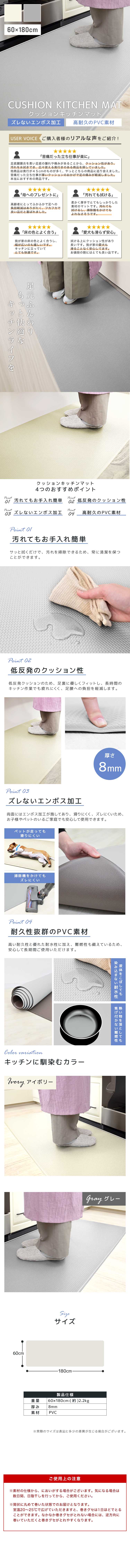 でも、汚れたマットをこまめに洗うのはめんどくさい…。 マットが滑りやすくて掃除機をかけるときにぐちゃっと丸まってしまう…。 そんなお悩みには、お洗濯不要!汚れやキズから床を守る、クッションキッチンマットがオススメです。 ■汚れ・水シミから床を守る 撥水性のあるPVC素材を使用してるので、汚れやシミに強く、 食べ物や飲み物をこぼしてもサッと拭くだけ!お手入れも簡単です。 ■低反発のクッション性 長時間のキッチン作業でも疲れにくく、足腰への負担を軽減します! ■ピタッとズレない快適設計 裏面が床にピタッと密着してズレを防止。 ■L字の折り目がスキマをカバー キッチン台と床のすき間にぴったりフィットするL字型の立ち上がりが、 床とキッチンの隙間に入り込むゴミや液体をシャットアウト! お掃除の手間もぐんと減ります。 【商品仕様】 カラー:グレー サイズ:(約)60cm×180cm 厚み:(約)8mm 重量:2.2kg 素材:PVC 【注意事項】 ・伸縮性のある素材のため、サイズに多少の誤差が生じる場合があります。 ・商品は、モニターによって色合いが異なって見える場合があります。 ・仕様・デザインは改良のため予告なく変更することがあります。 |