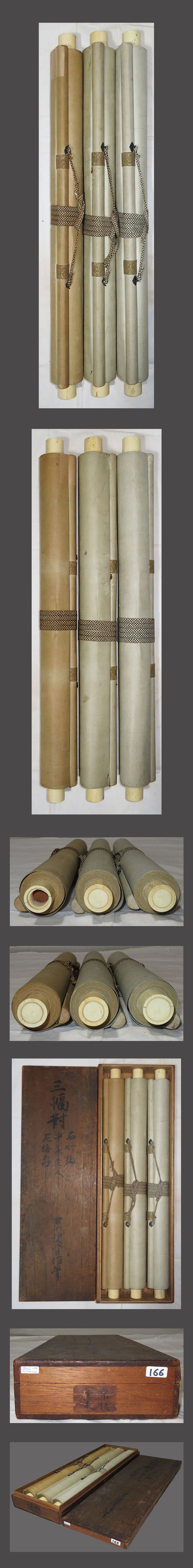 肉筆、真作保証。 【左側掛軸:梅亀図】 作品に、時代感、シミ、汚れ、折れ、巻きじわ、スレ、傷んでる箇所があります。 表装に、時代感、多数のシミ、汚れ、折れ、巻きじわ、傷み、補修箇所があります。 表装下部裏側に、経年による傷み、補修箇所があります。左側軸の軸蓋はありません。 表装廻りの色合いが違ってます。 【中央掛軸:寿老人図】 作品に、時代感、シミ、汚れ、折れ、巻きじわがあります。 表装に、時代感、多数のシミ、汚れ、折れ、巻きじわがあります。 【右側掛軸:竹鶴図】 作品に、時代感、シミ、汚れ、折れ、巻きじわがあります。 表装に、時代感、多数のシミ、汚れ、折れ、巻きじわがあります。 表装裏側に、経年によるシミ、汚れがあります。 箱は合わせ箱です。軸先にヒビがあります。 狩野常信 略歴:美術評価額1000万(画)号古川・ 法号養朴、尚信男、没年正徳3年、享年78歳。 下記の真作保証について・注意事項をよくご覧の上、 お気に召された方に、お譲り致しますので、ご入札を宜しくお願い致します。 |