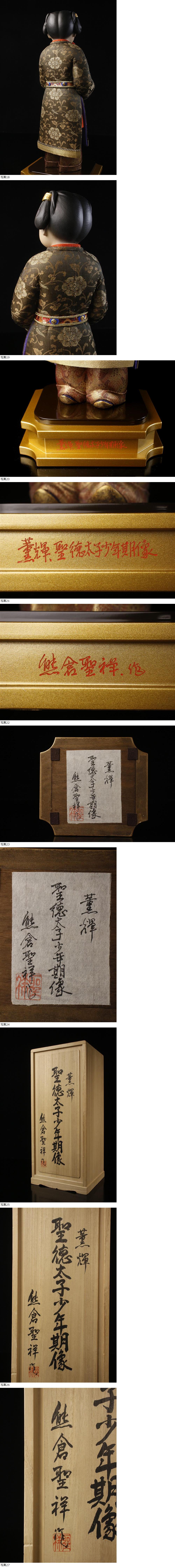 26022812* * * 商品詳細 * * * ここでしか出逢うことのできない唯一の美をご紹介させて頂きます。 まるで生きているかのようなリアリティ、今にも動き出しそうな聖徳太子少年期像のご紹介です。 作者は熊倉聖祥氏。節句人形のレベルを底上げした第一人者であり、 業界に流通する約80%が熊倉聖祥氏原作の頭だといわれています。 造形のレベル非常に高く、圧倒的な仕上がりと強い存在感を放っています。 子供らしい愛らしさがありながら凛とした緊張感があり、聖徳太子という特異な人物をよく表現しています。 輝く瞳は瑞々しく生気に満ちており、体温すらも感じさせる作者の圧巻の造形力と表現力が遺憾なく発揮されています。 見応えも抜群、正に一級品の素晴らしい逸品をこの機会に是非お手元にてご堪能下さい。 作家略歴 1931年 新潟県に生まれる 1947年 日本人形界の戸部瑞松を師に人形界に入る。日本人形界の藤野永照斎門下に入る 1950年 人形制作の一方で日本画家、桐岡進氏に、絵画を学ぶ 1955年 日展、長谷川宏氏(号・雅宣)を師に、彫塑を学び、絵画と彫塑を同時に勉強す 1957年 藤野永照斎より独立したマネキン業界に入り、主に原型制作にあたる 1972年 日本人形業界に復帰、創作の制作に入る 1976年 絵画では日本画より油絵(洋画)に転向し、グループ展を主に11回出品す 1987年 内閣総理大臣賞(日本人形協会)、その他各種賞を受ける 1995年 11月紫ギャラリー(東京都千代田区有楽町)にて古典を開催する) 1996年 朝日新聞(3月3日付)の「ひと」の欄で全国に紹介されるミキモト本店ホール(東京都中央区銀座)にて個展を開催する ■商品内容/聖徳太子像、共箱 ■サイズ/横18cm×高42cm×奥行16.5㎝ 箱:横23cm×高52cm×奥行22㎝ ■状態/スレ、小キズ、指に極々小さな剥げ、箱にスレ、小キズ、潰れがございます。 ※写真にてご確認、ご了承の上ご入札下さい。 * * * 支払詳細 * * * !かんたん決済 * * * 発送詳細 * * * 入金確認後3営業日以内に発送致します。 ※直接引き取りも可能です。 60~160サイズにつきましては 佐川急便、ゆうパックのどちらかで発送いたします。 ゆうパック発送の場合、弊社の発送日から追跡サービスに問合せ番号が反映されるまで 約1日ほどお時間がかかりますのでご了承下さい。 * * * 注意事項 * * * 運送中の破損があった場合は速やかに当社までご連絡下さい。 保険を利用するのに受取連絡後に運送会社による現場での破損状況確認が必要となります。 勝手に返送されますと保険の適用外となりますのでご注意ください。 * * * * * * お問い合わせ:082-236-8669 |