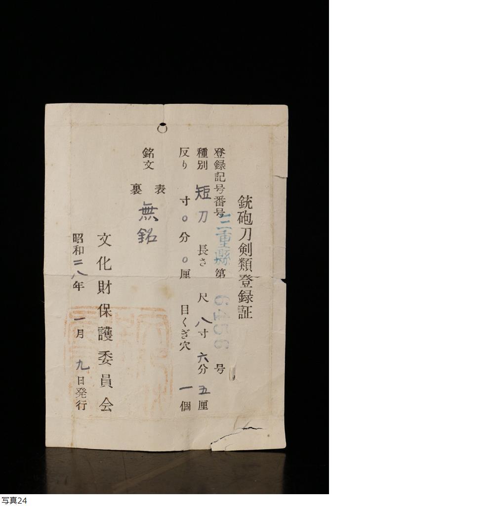 251212T19* * * 商品詳細 * * * ここでしか出逢うことのできない唯一の美をご紹介させて頂きます。 すっきりとした刀姿が刀剣ならではの緊張感を携えた 保存刀剣鑑定書付の短刀のご紹介です。 明るく輝く本身には緩やかではっきりとした刃文が爽やかに輝き 凛とした刀姿は鑑賞者の目を惹き付ける逸品です。 26㎝という長さながらも存在感のある一振を、 この機会にお手元にてご堪能下さい。 ■商品内容/短刀本体、白鞘、鑑定書、登録証。 ■本身サイズ 全長/36㎝ 刃渡/26㎝ 元幅/2.4㎝ 先幅/1.7㎝ 元重/0.5㎝ 先重/0.3㎝ 本身重量/137g ■状態/スレ、傷、錆び、切先に小さな潰れ、刃毀、 ハバキをはめる所に潰れ、白鞘にスレ、傷、汚れ、シミ、焼け、登録証に破れがございます。 ※写真にてご確認、ご了承の上ご入札ください。 ご落札(購入)後は所定の期日までに都道府県の教育委員会に所有者変更の届出をお願い致します。 * * * 支払詳細 * * * !かんたん決済 * * * 発送詳細 * * * 入金確認後3営業日以内に発送致します。 ※直接引き取りも可能です。 60~160サイズにつきましては 佐川急便、ゆうパックのどちらかで発送いたします。 ゆうパック発送の場合、弊社の発送日から追跡サービスに問合せ番号が反映されるまで 約1日ほどお時間がかかりますのでご了承下さい。 * * * 注意事項 * * * 運送中の破損があった場合は速やかに当社までご連絡下さい。 保険を利用するのに受取連絡後に運送会社による現場での破損状況確認が必要となります。 勝手に返送されますと保険の適用外となりますのでご注意ください。 * * * * * * お問い合わせ:082-236-8669 |