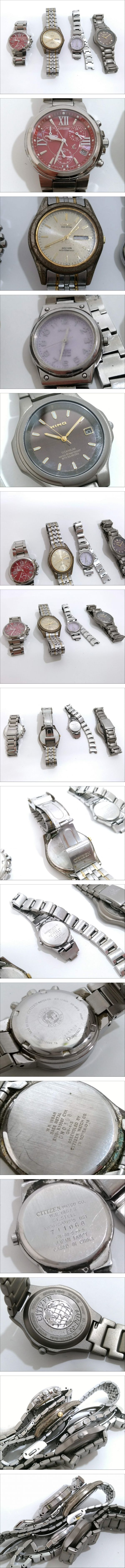 ※佐川急便の場合、離島など別途中継手数料がかかる地域が御座います。 その場合はお振込みを追加でお願いする場合が御座います事、 事前にご了承の程、宜しくお願い致します。 [商品名] 1円スタート 【美品含む】CITIZEN シチズン Eco-Drive エコドライブ ソーラー電波 腕時計 4点セット [参考サイズ:左の時計] ケース(リューズ込み)約4×3.4cm, 風防(ガラス/樹脂面)直径約2.6cm, ベルト幅約1.7cm, ラグ幅約0.9cm, 腕周り約14cm [型番] H504-T012493 E100-K15567 E030-S001935 7875-H00559 [状態] 左の時計はきれいです。 他3点は風防含む全体に小キズ、汚れ、メッキハガレ、 ベルトに破損、ちぎれのある物が御座いますが、 その他は良いと思います。 左の3点の時計は出品時点では作動しておりますが、 二次電池の残量は不明となっております事、 ご承知くださいませ。 右の時計の電池は切れております。 状態ランクは外観の状態のみで、 動作保証をするものでは御座いません。 電池交換、オーバーホール、等メンテナンスは落札者様でお願い致します。 時計は落札時の現状でのお渡しとなります。 付属品は写真のものが全てです。 記載の無い状態がある場合も御座いますが、写真でご判断下さい。 上記状態・条件を御理解頂ける方のみ、御検討の程、宜しく御願い致します。 現状での通常使用が可能かどうかは不明です。 専門知識がないため、不明な破損個所や、作動不良などがある場合も御座います。 メンテナンスや修繕、修理が必要な場合もありますが、御落札者様でのご負担でお願いいたします。 状態ランクは外観の状態のみで、動作保証をするものでは御座いません。 メンテナンス、修繕、修理等は御落札者様でお願い致します。 ご理解の上の、ご入札をお願いいたします。 [状態ランク] AとB