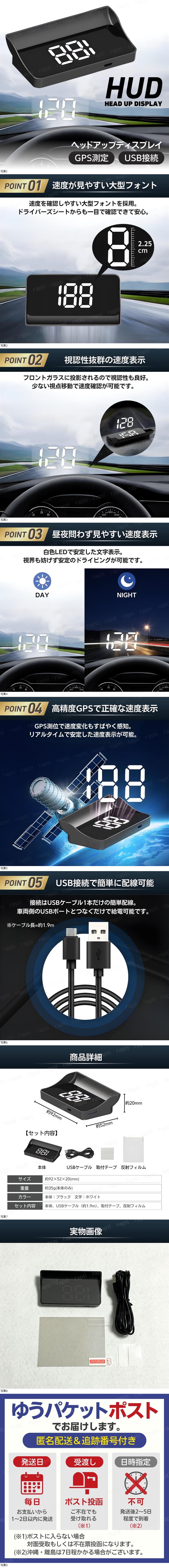 | ヘッドアップディスプレイ HUD GPS搭載 スピードメーター デジタル USB電源 LED 汎用 投影式 自動車 トラック 軽 ケーブル 速度 追加 付属 |