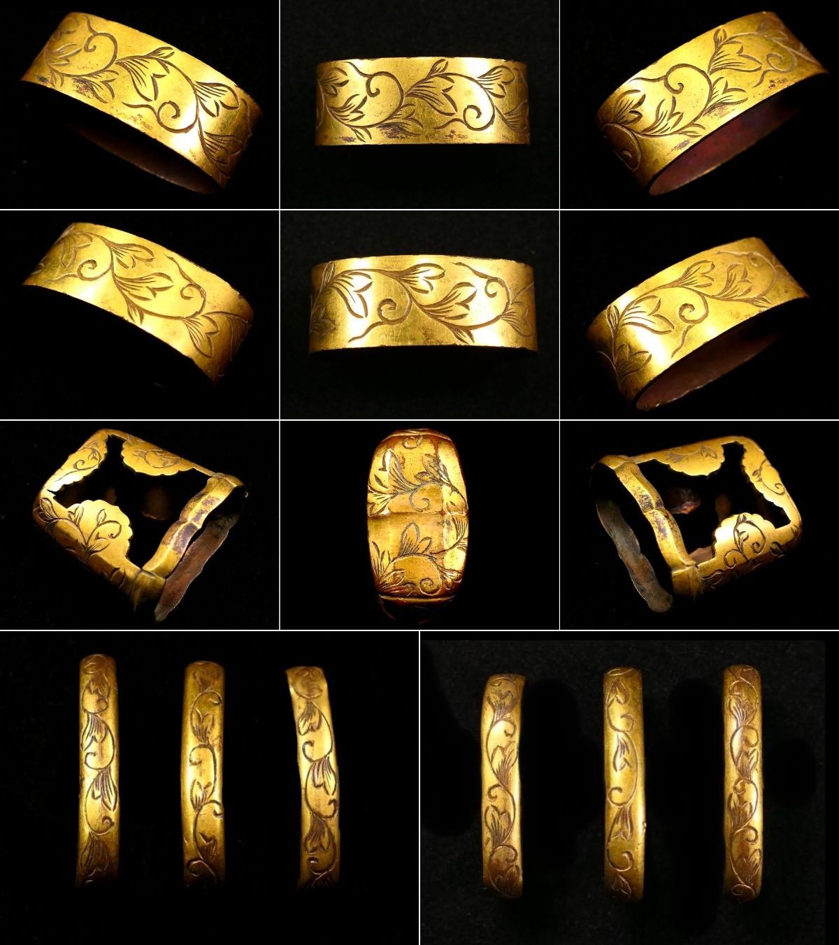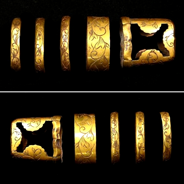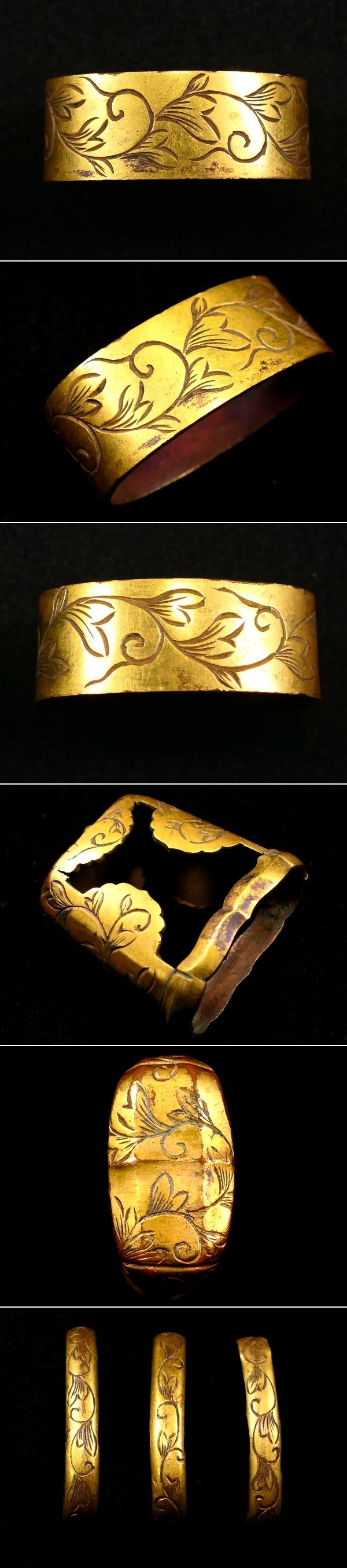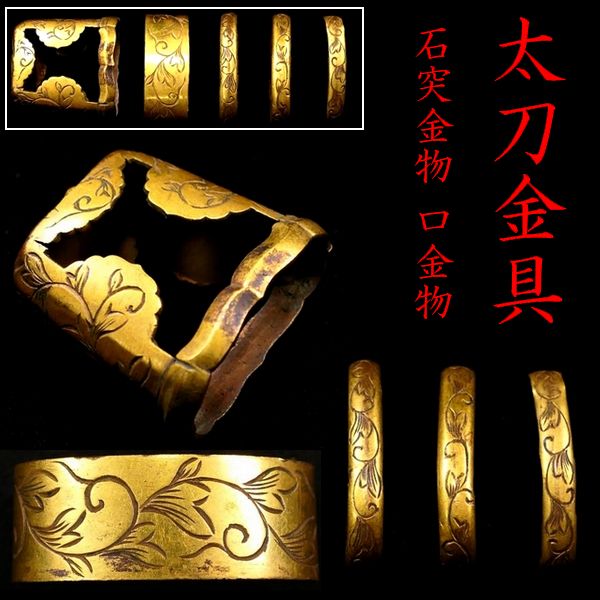 | 商品説明 | ~寸法~ (口金物) 約 3.60cm × 約 2.07cm × 約 1.36cm (厚み) (石突金物) 約 3.37cm × 約 3.40cm × 約 1.70cm その他の寸法は、上記のサイズを比較して下さい。 素銅地に華やかな金色絵と 毛彫りの唐草図が施された 太刀金具のセットです。 拵作りのパーツにいかがでしょうか。 必要な方、この機会に是非手に入れて下さい。 大切にして頂ける方の元へ届けば幸いでございます。 ~状態~ 状態は画像の通りとなります。 色絵のはがれや小傷等ございます。 その他、古い物ですので多少の時代傷みはご理解下さい。 状態等詳しくは画像にてご判断下さい。 |