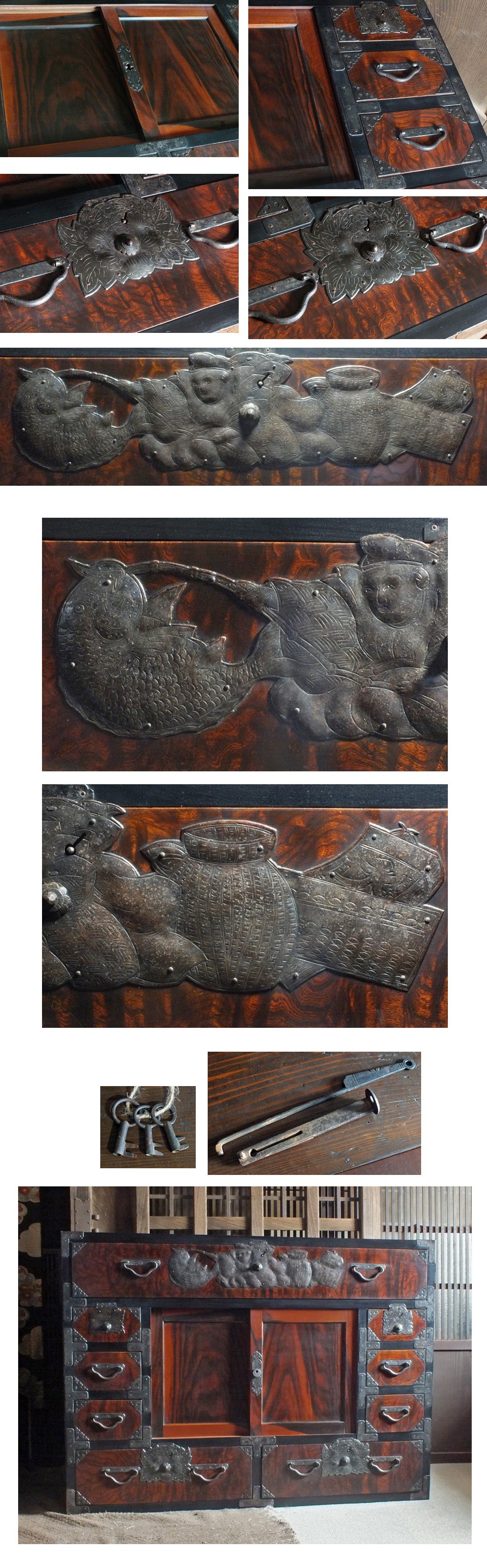 こちらのお品も時代箪笥の優品が多く残された仙台らしく睨み錠前は大きく大胆な構図で恵比寿図が大きな鯛を吊り上げる様子、中央に立体的な手掛け錠、右側に算盤や大福帳のデザインがあしらわれ、洒落心ある職人の気概が窺えます。