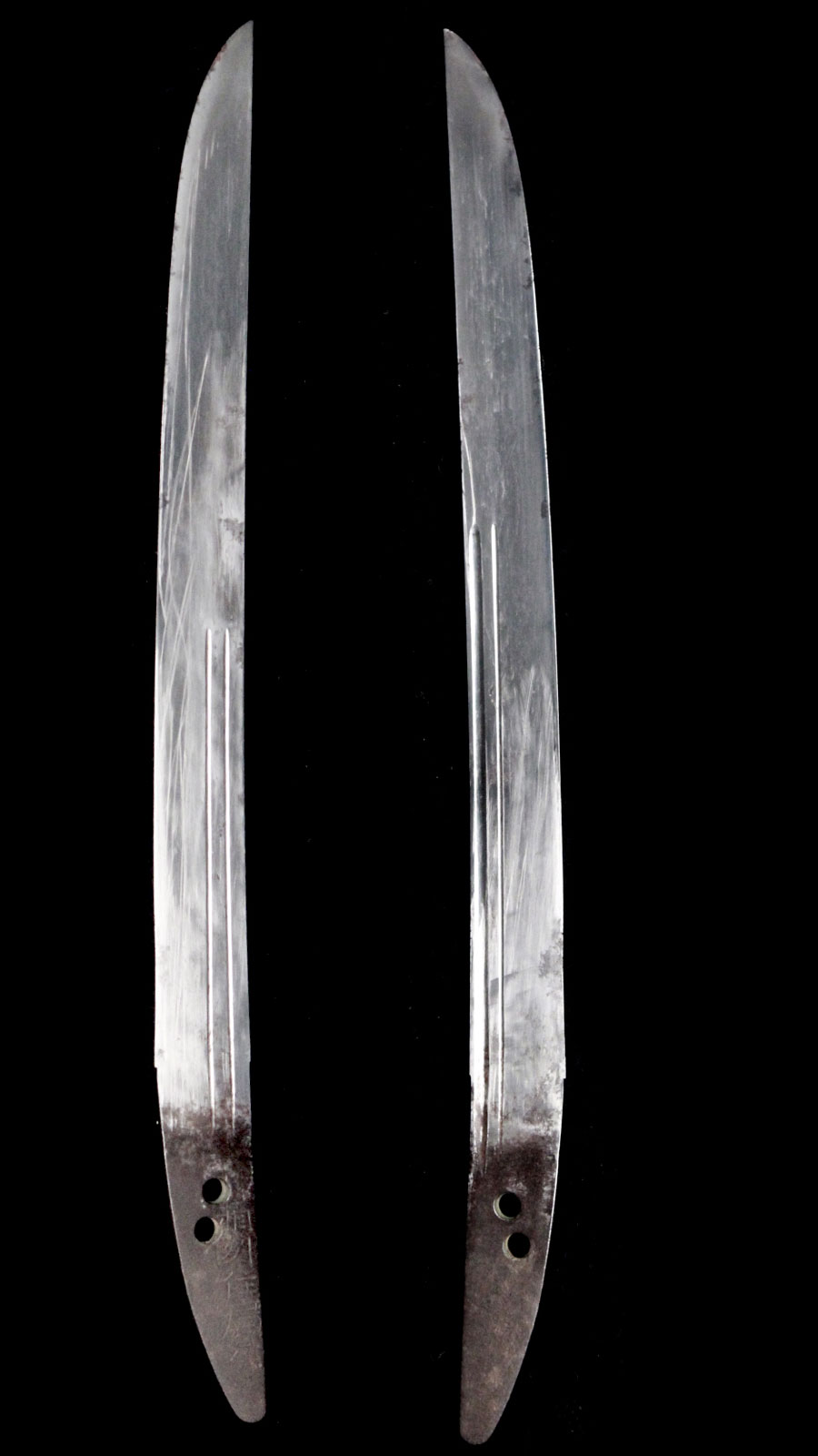 刀身長:約26.7cm 反り:約0.1cm 目くぎ穴:2個 元幅:約26.5mm 元重:約4.9mm 先幅:約18.8mm 先重:約2.5mm 刀身重:約159g 棟:庵棟 ハバキ:銅 |