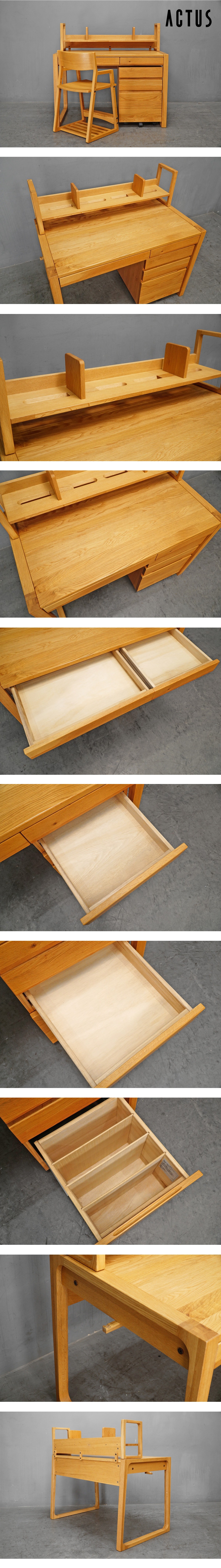 ◇ACTUS(アクタス)のFOPPISH (フォピッシュ) デスク ロータイプブックシェルフセットです。 ロングライフデザインをコンセプトに作られたフォピッシュシリーズは「質実剛健」。 しかも、大人が使うことを想定した、細部へのこだわりが詰まっています。天板の広さはアクタスのデスクの中では最大、引き出し5杯も最多。天板の左右幅いっぱいにデスクシェルフが付けられるので、大きさ、収納量ともにNo.1のデスクです。子どもから大人まで、あらゆる世代の人に使っていただける無駄のないデザインが特徴の無垢のオーク材を使った本格的な大人仕様の家具です。 チェアはアクタスのFチェア。 オーク材の学習机と相性が良い、アクタスオリジナルデザインのチェアです。 チェアのシートと足置きは成長に合わせて高さが変えられるようになっているため、正しい姿勢がいつまでもキープできます。レッグに取り付けられたキャスターは、椅子に腰を掛けると体重でストッパー機能がONになり、椅子が動かないよう抑制します。 また、足元にはランドセルが置ける仕様になっているため、帰宅後に片付ける場所に困ることもありません。お子さまに安心してご使用いただけるF☆☆☆☆レベルの安全性の高い製品です。 参考新品価格(約):154,000円(デスクセット/116,600円+チェア/37,400円) |