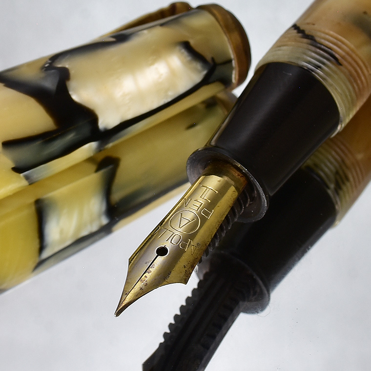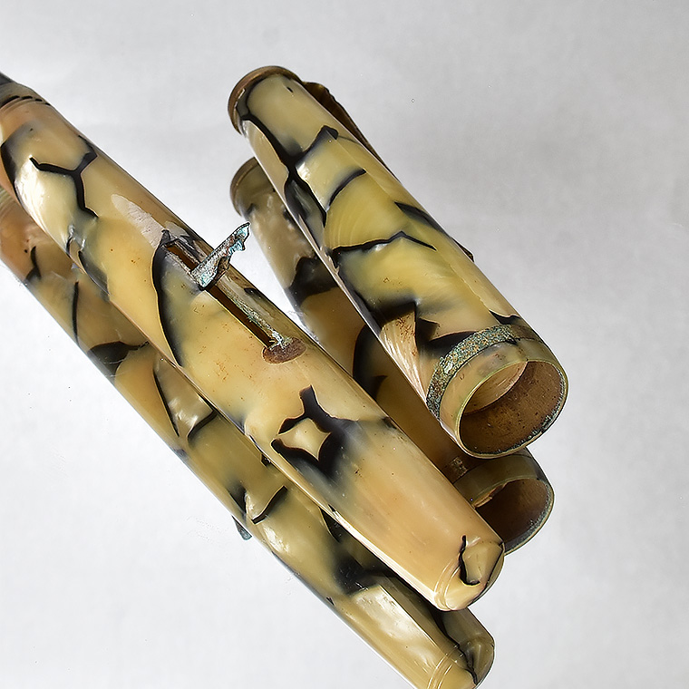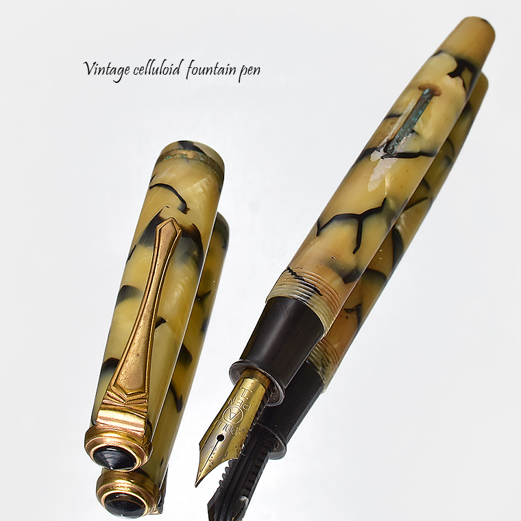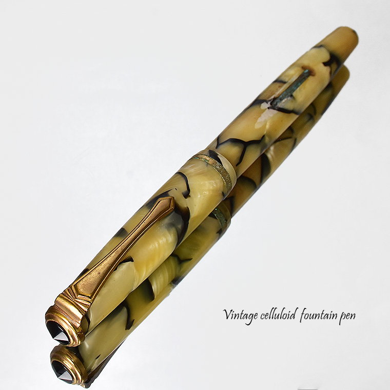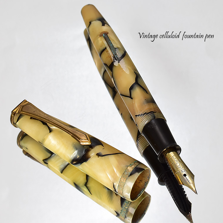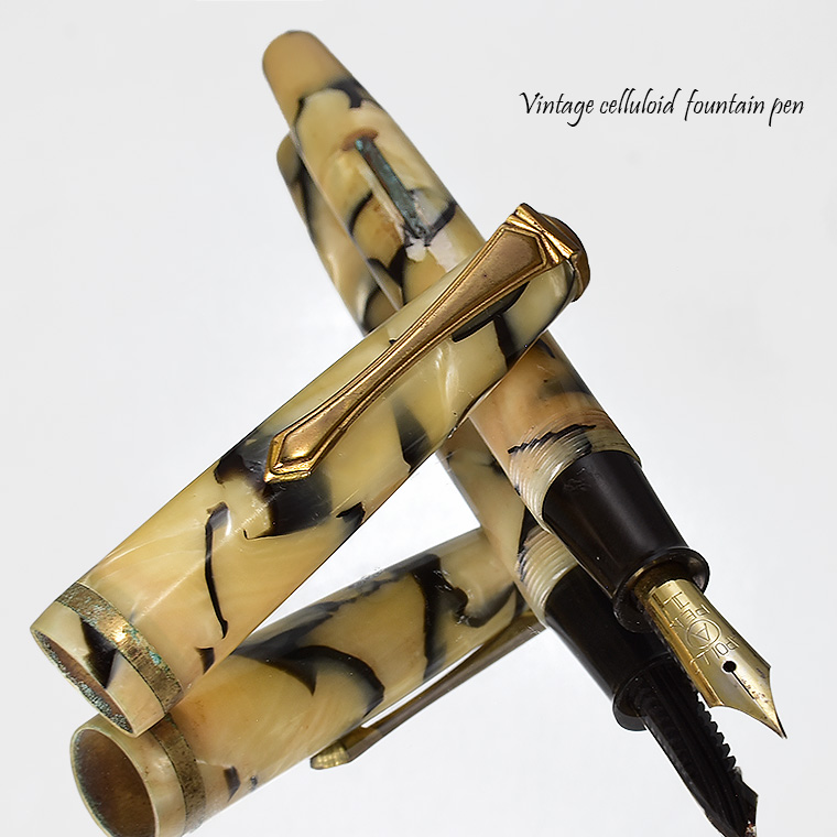 | ビンテージ セルロイド万年筆 レバーフィラー式 ペン先:EF(極細) Made in JAPAN 日本製 レストア ![]() 終戦を迎えた70年程前、かつて日本の下町などでたくさんのセルロイド工場や 加工場があった時代・・そういった工房で凄腕の職人さんが、ハンドメイドで仕上げた万年筆。 今回ご紹介するのは、そんな過去の貴重なセルロイド万年筆をレストアしたものです。 ![]() 職人さんの工房で保管されていた数少ないセルロイド万年筆を、彼の手によって 少しずつレストアしていただきながら、そしてその手法を教えていただきながら 出来上がったもの、譲ってもらったものです。 約半世紀の間、大事に保管されていたとしても、メンテナンスは必要なコンディションでした。 その為、その職人の指導の下、ひとつひとつ古い部品を取り換え、ニブの調整をするなど、 メンテンナンスを行った1本になります。 ![]() <レストアを行うにあたり…> パーツが手作りなので、一つ一つ適したものを合わせていきます。 ペン先を選びます。ペン芯とペン先がマッチしないと書けません。 当時のペン先は、適合させて温度をかけて、緩めたり固定したりする必要があります。 かける状態にするまで多くの手がかかりますが、職人さんが作ったペン先、そのしなりや書き心地は 現在の市販の万年筆では味わうことができません。 ペン先の本当の魅力を引き出すのが職人の技です。 ![]() インクの吸入は「レバーフィラー式」。 レバーを手前に引くと、中にある板金がゴムチューブを圧迫し、その復元力でインクを 吸入する仕組みとなっています。現在ではコンバーター式が主流になっていますが、 実はこのレバーフィラー式がインク吸入方式の中で最も使いやすい方法なのです。 ![]() <セルロイドの魅力> 素材はセルロイド、 角度によって、次々と色味をかえるセルロイドは、まるで光が瞬いているようにも見えます。 また、滑らかな肌触りのセルロイドは、しっとりとした質感と 程よい重さをもっているので、本当に心地よいホールディングを堪能いただけます。 ![]() 今回紹介する万年筆も美しい1本です。 ビンテージ万年筆の魅力は、時代を反映した独特なデザイン、現在では入手困難な素材。 そして、時間の経過とともに増すビンテージの風合いではないでしょうか。 使い込む程手に馴染み、愛着が湧いてくる楽しさは、ビンテージ万年筆でしか味わう ことができません。 貴重なビンテージ万年筆との出会いも一期一会です。 是非ご覧ください。 ************************************************************************* <詳細>希少 ビンテージ セルロイド万年筆 ベージュブラウン モザイク レバーフィラー式 レストア 個数 :1本 ニブ :スチール(日本製) サイズ:EF(極細)*サイズ表記なし 機構 :レバーフィラー式 材質 :セルロイド 長さ :約130mm 太さ :約11mm/12.4mm(キャップ) 重さ :約12g 付属品:発送用紙ケース ※ 生産から数十年という時間が経過しているため、 本体に細かな擦り傷や金属部などに錆などの経年変化が見られます。 筆記には問題はございませんが、ビンテージ品の特性として ご理解の上、ご入札をお願いいたします。 今回出品のこちらは、 金属部分(リング/レバー)に錆がかなり儲けられます。 またペン先が左側へ少し傾いています。 写真を掲載していますのでご確認の上、入札お願いいたします。 ※モニターの環境により、画像と実物の色合いが若干異なる場合がございます。 予めご理解・ご了承の上、ご購入お願い致します。 ************************************************************************ |