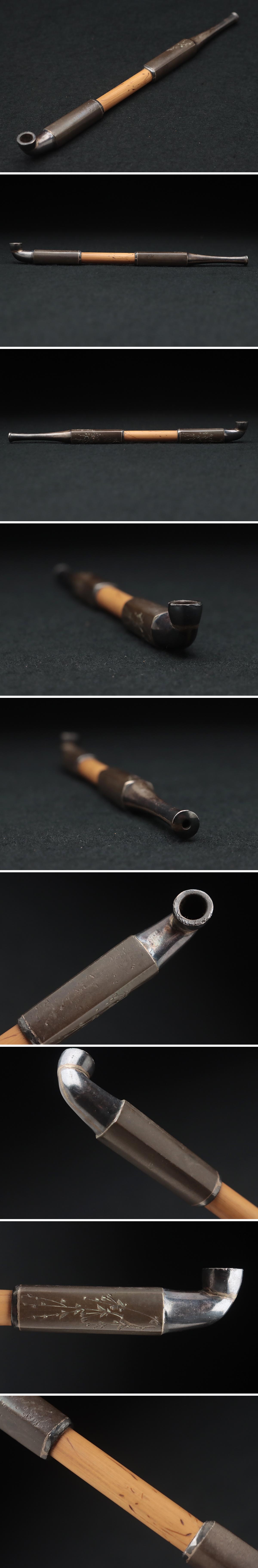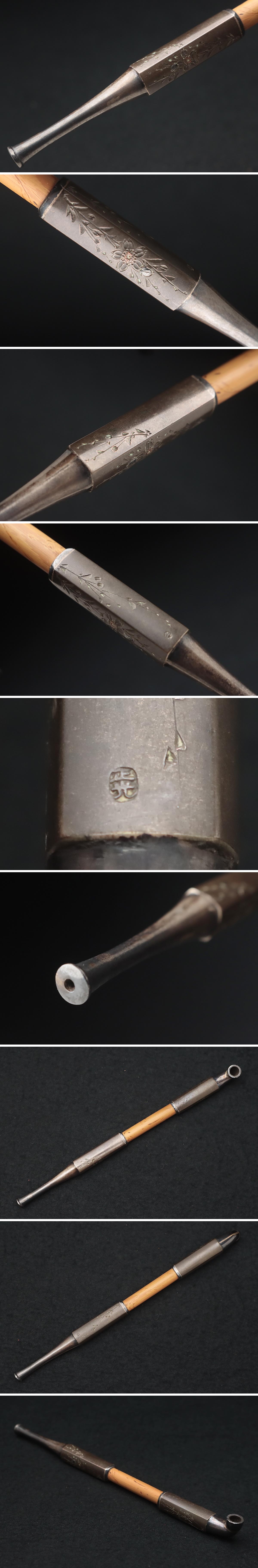| ◆ 時代金工【正光 作】喫煙具 金工銀地四分一銀象嵌 片切彫 枝垂れ桜図 煙管 全長17.8cm・銀煙管 提げ物 旧家蔵 古美術 ◆