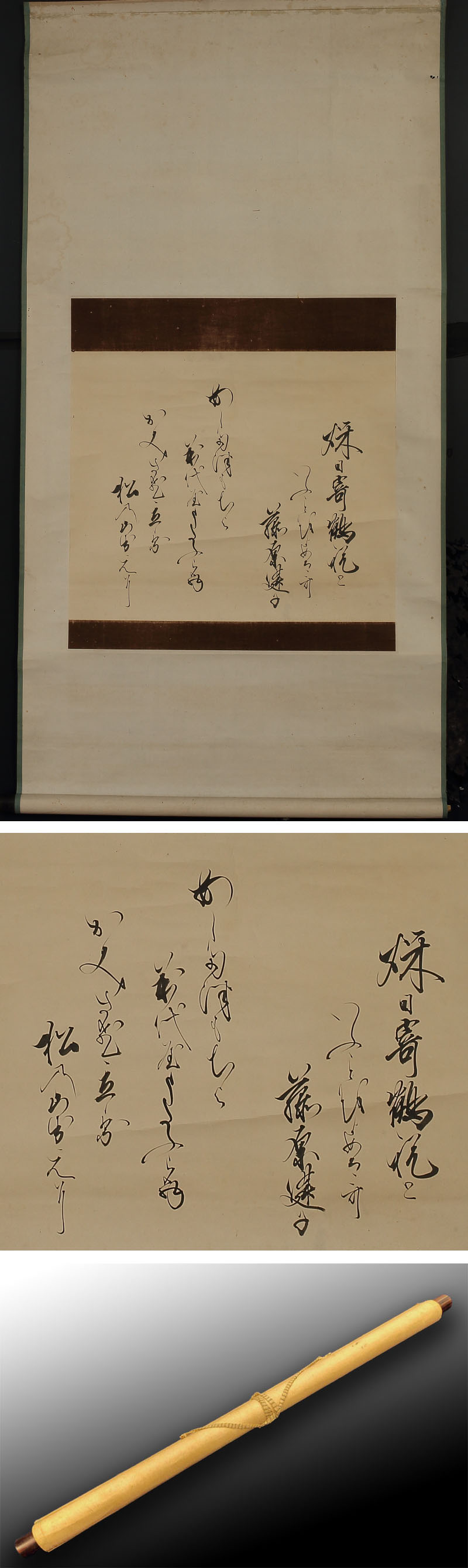 慈貞院健子の和歌詠草です。 「芦田鶴も千代万代や謡ふらむ 神さび立(たつ)る松の梢に」と詠んでおります。 慈貞院は幼名を貢姫と称し、肥前佐賀藩主・鍋島直正(閑叟)の愛娘として大切に育てられました。安政2(1855)年に彼女が嫁いだのは相模湾の海防の要衝を任された武蔵川越藩であり、夫となった藩主・松平直侯は水戸藩主・徳川斉昭の実子で一橋慶喜の弟と、わずか17歳で政局の最前線に身を投じたといえます。閑叟は貢姫に水戸家の情勢や幕閣の動向を尋ねる書状を送っており、まだ幼い弟・直大以上に閑叟が頼みにした人物といっても過言ではありません。 しかし文久2(1862)年に夫・直侯が若くして没し、落飾し「慈貞院」と称しました。慶応4(1868)年2月には江戸の政情不安により川越藩の政庁が新たに移転した前橋に向かいますが、川越藩(前橋藩)は予てより新政府から旧幕への内通を疑われており、その関係からか慈貞院も鍋島家へと帰されています。以後半世紀を鍋島家の庇護の元過ごしました。 慈貞院は有栖川流の名手として知られ、本作もその壮麗な書風を呈します。「松の梢」を詠った内容からも婚家川越藩松平家もしくは徳川家の慶事に関する作だったのでしょう。敬慕が感ぜられる逸品です。 ◆慈貞院健子 幕末~大正期の武家女性。鍋島直正(閑叟)の娘。諱は初め貢姫、建子。安政2(1855)年に武蔵川越藩主・松平直侯(徳川斉昭八男)に輿入したが、文久2(1862)年に死別。出家したのちもしばらく川越藩邸に暮らしたが、慶應4(1868)年江戸の政情不安により武雄で鍋島藩の庇護の元過ごした。維新後は上京。大正7(1918)年没、80歳。 〔本文〕 秋日寄鶴祝と いふことをよめる哥 藤原建子 あしたつもちよ 万代やうたふらむ かみさひ立る 松のこすえに 付属:時代箱が付属します。 寸法:高さ109cm、幅57cm(最大幅。若干の誤差はご了承下さい) 状態:経年感、オレがございます。 |