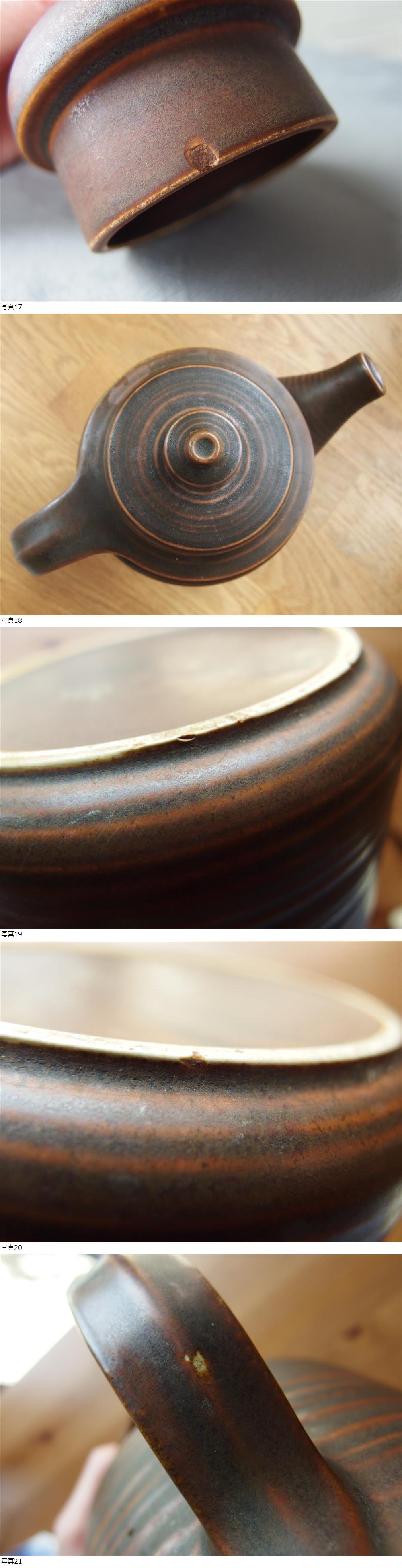 液体が流れたような白っぽい跡が表面に薄っすら見られますが、作品の雰囲気を損ねるものではありません。高台に小さなカケ少しあり。持ち手に白い箇所ありますが、釉薬の塗り具合で出来たものです。