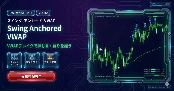TradingViewで4,200以上の「いいね」を獲得した人気インジケーター「Swing Anchored Vwap [BigBeluga]」をMT4向けに変換したインジケーターです。 通常のVWAPは時間が経つと価格から離れてしまい使いにくくなりますが、本インジケーターはスイングポイント(転換点)でVWAPを自動リセット。常に価格の近くに「使えるVWAP」を表示します。