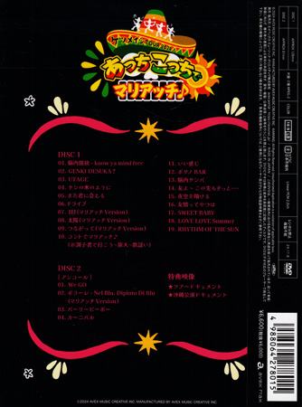【内容】 2024年3月から全国12会場21公演で計20万人を動員した全国アリーナツアー「ケツメイシ TOUR 2024 あっちこっちでマリアッチ♪」の横浜アリーナ公演を収録! 【収録内容】 ▽Disc-1 1)脳内開放 - know ya mind free 2)GENKI DESUKA? 3)UTAGE 4)ヤシの木のように 5)また君に会える 6)ドライブ 7)1日 (マリアッチVersion) 8)太陽 (マリアッチVersion) 9)つながって (マリアッチVersion) 10)コントでマリアッチ♪ (お調子者で行こう 旅人 歌謡い) 11)いい感じ 12)ボサノBAR 13)脳内サンバ 14)友よ この先もずっと… 15)夜空を翔ける 16)友情ってやつは 17)SWEET BABY 18)LOVE LOVE Summer 19)RHYTHM OF THE SUN ▽Disc-2 1)We GO (アンコール) 2)ボラーレ - Nel Blu, Dipinto Di Blu (マリアッチVersion) 3)パーリーピーポー (アンコール) 4)カーニバル (アンコール) 5)ツアードキュメント (特典映像) 6)沖縄公演ドキュメント (特典映像) 【特典内容】 特典映像/特殊パッケージ仕様/ツアーグッズイラストステッカーシート | |||||||||||||||||||||||||||||||||||