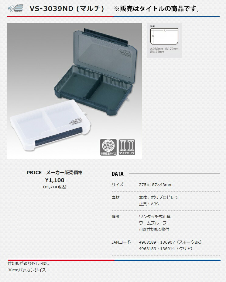 メイホー MEIHOツールケース VS-3039ND(マルチ)※販売はタイトルの商品です。仕切板が取り外し可能。30cmバッカンサイズ■DATA・サイズ 275x187x43mm・素材 本体:ポリプロピレン 止具:ABS・備考 ワンタッチ式止具 ワームプルーフ 可変仕切板1枚付