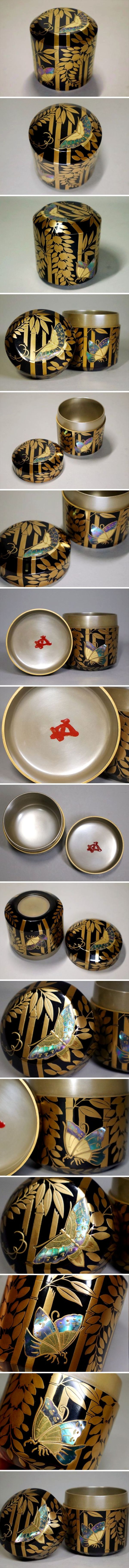 本物保証。状態良好で綺麗です。鵬雲斎在判 竹藤蝶蒔絵棗です。箱はありません。棗全体に竹、藤、蝶の蒔絵が大変細かく丁寧に描かれています。蝶の羽には青貝を用いており、華やかで美しい仕上がりになっています。