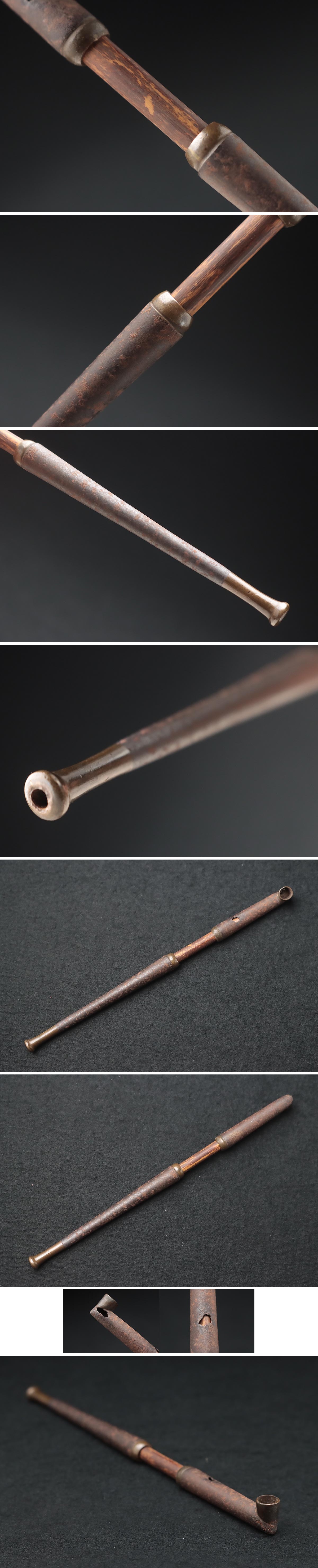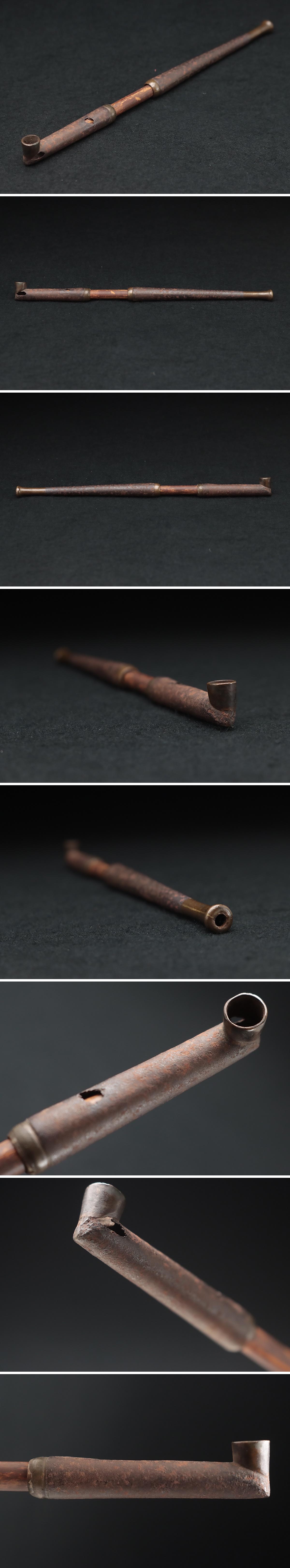 | ◆ 時代喫煙具 鉄銅口煙管 全長19.8cm 竹羅宇含む重29g・銅口鉄煙管・旱烟管 提げ物 古金工 古美術 ◆