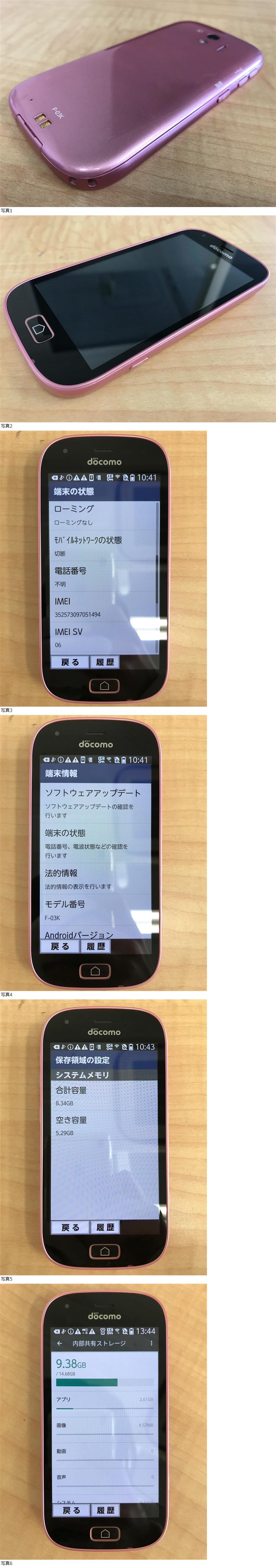| 商品説明 | ・タッチ、ボタン操作・サウンド関係・カメラなど簡単な動作確認済みですが、長時間での詳細な確認はしておりません。ご了承の上ご入札ください。 ・本体のみの出品になります。 ・電源を落とし再度入れた後に、エラー画面が表示されます。 待ち受け画面に切り替えられることは確認済みですが、予めご了承の上ご入札ください。 ・動作が多少遅めかと思われます。ご了承ください。 ・背面の左上角(アンテナ部分)にキズがございます。写真にてご確認ください。 ・その他小キズや汚れなど見受けられます。ご了承ください。 ・写真には写りきらない汚れ、キズなどある可能性がございます。 ・SIM:ドコモ ・IMEI :352573097051494 ・初期化済み ・水没判定 : 不明 ・ネットワーク判定OK ≪注意事項≫ ※毎週月曜日は休みを頂いております。日曜日の17時頃から火曜日の午前中まで、連絡・発送等の対応が出来かねますので予めご了承くださいませ※※ ※商品の送料に関しましては本文下部に記載しておりますのでご確認ください。※※ ・写真に写っているものが全てです。キズ、ヨゴレ等、状態については画像にてご自身でご確認いただき、画像にてご判断頂ける方のみご入札ください。 ・写真には写りきらないキズ・汚れ等ある場合がございます。予めご了承下さい。 ・商品の写真と実際の色がモニターの種類、照明の違い等により少し実物と違って見える場合があります。 ・商品をご理解の上、ノークレーム、ノーリターンでお願い致します。 ・商品落札当日、夕方以降のご質問には対応出来かねますのでご了承ください。 ・分かる範囲内で質問等にはできる限りお答えしますので、お気軽にお問い合わせください。 ≪お支払い方法≫ ■ヤフーかんたん決済 ※かんたん決済期日を取引期限といたします。期限を過ぎた場合は取引をキャンセルさせて頂きますので予めご了承ください。 ≪発送詳細≫ ※ゆうパック、商品によっては定型(外)郵便、レターパックで対応致します。 ※商品の発送は責任を持って行いますが、万が一の運送時の事故や破損、紛失等(特に定形郵便・定形外郵便)には責任を負いかねますので、発送方法等は十分にご考慮のうえお選びください。 ※実際に梱包した際にサイズ、重量に差異が出る場合が御座いますが、差異分の追加請求または返金の対応はしておりません。 ※その他の発送を希望される場合は事前に、落札前にご連絡下さい。 ※こちらの商品は愛知県からの発送になります。 ※出来る限り迅速な対応を心がけていますが、個人出品になりますので、ご連絡が遅れる場合があります。 ※ご入金後、3日前後で発送いたしますが、土日祝・盆・年末年始等は発送が遅れる場合があります。 ★上記の内容に理解を得らる方、また画像で判断できる方のみご入札をお願いします。 | |