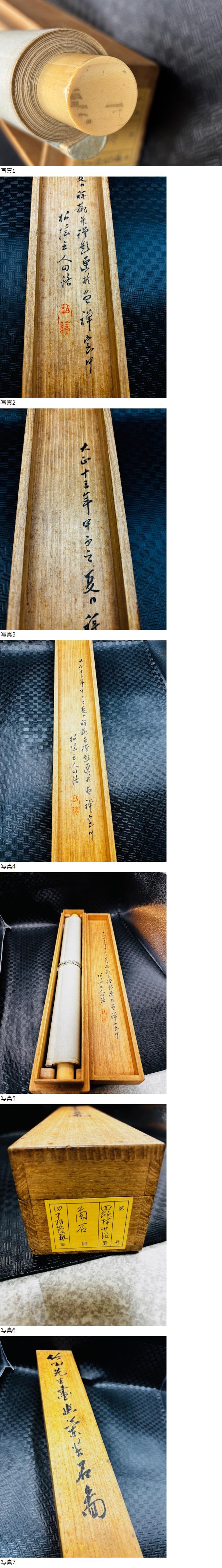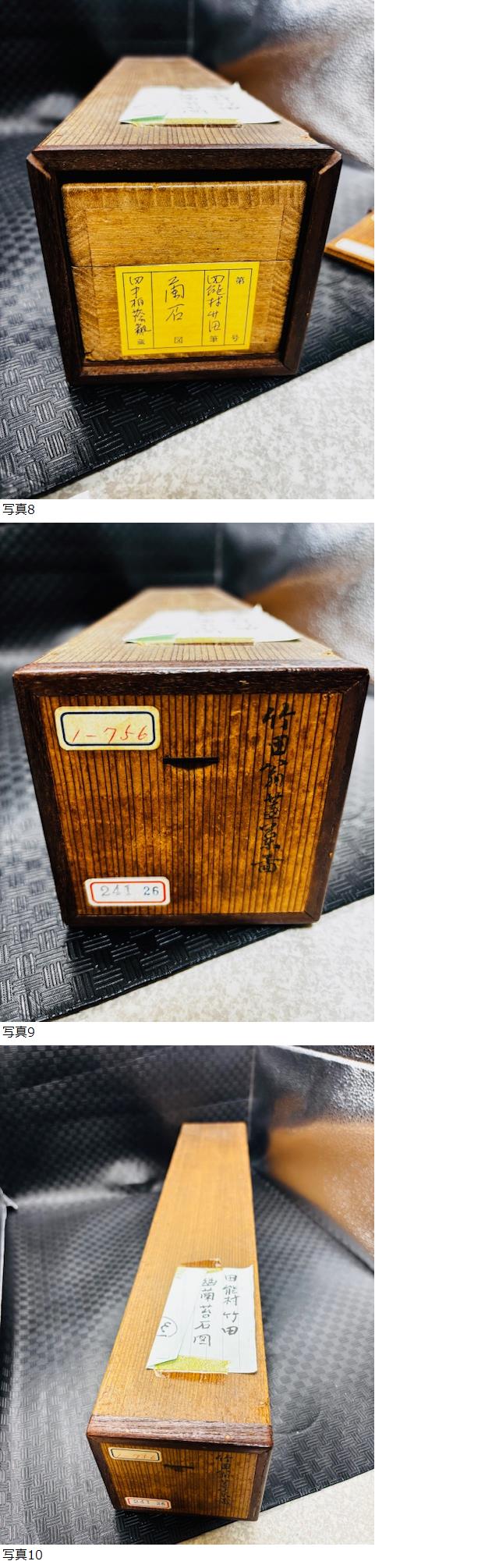 蘭石図 田能村竹田先生百年祭遺墨展観會出品 安岡拙治氏所蔵 全体 約 41,5x160cm 本紙 約 26,5x 80cm 素人採寸のため多少の誤差はご容赦ください 茶道家の方からのお買取り品となります 箱の中の安岡拙治氏所蔵の紙が右上剥がれかかっております 箱書きには柏蔭の落款あり 箱付き 二重箱 出品にあたり鑑定機関での鑑定は受けておりません 当方、骨董専門ではなく持ち主の情報、箱書きを元に出品させて頂いております 専門知識がない為、写真にてご判断いただきご入札をお願いいたします 状態は、古い物のため写真にてご判断ください ※ご注意※ オークションではガイドライン上、美術品出品の際「真作」「模写」と明記するようになっております 真作と明記した作品が万が一真作でない場合は返品の上、落札金額と送料を返金のご対応をさせて頂きます 返品にあたり真作でない旨を記載した公共鑑定機関での鑑定書のご提示をお願いいたします 自称鑑定士等の鑑定ではなく、公共鑑定機関での鑑定をお願いいたします 鑑定に係る費用一切は落札者様のご負担でお願いいたします 当方では鑑定代行等を行っておりませんので落札者様にて手配、鑑定をお願いいたします 鑑定をする場合、商品到着後3日以内にご連絡を頂き、鑑定機関にて鑑定をお願いいたします 返品対応期間は商品到着後3週間とさせていただきますのでご了承ください |
