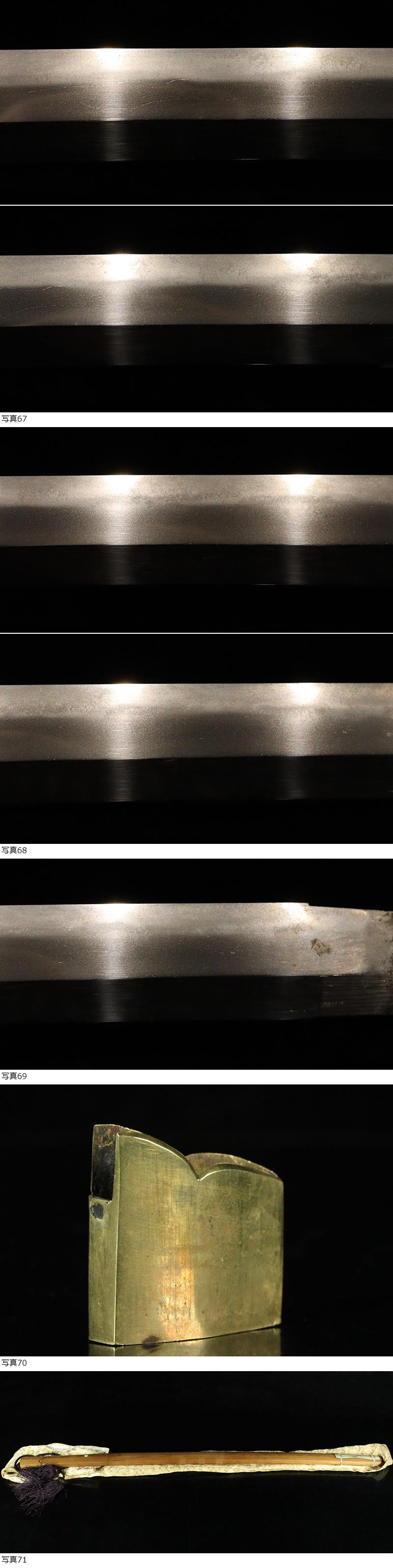 | ■刀剣のサイズ表示について 元幅・・・焼出し付近を測定しております 先幅・・・横手筋付近を測定しております 元重ね・・・焼出し付近の厚みを測定しております 先重ね・・・横手付近の厚みを測定しております (多少の誤差はご容赦ねがいます) ■銃砲類のサイズ表示について 全長・・・銃身先から台木尻までを測定しております 銃身・・・台木を除いて金属部分を測定しております (多少の誤差はご容赦ねがいます) 当社が出品する刀剣類は、入手した時の状態のまま出品しております。 ハバキ、小道具等も当社で調整したり付け替えたりはしておりませんので、合わせではないかというクレームは一切受け付けません。 刀身の疵も隠すことなく載せておりますので写真をよくご覧になってご入札ください。 疵に関して、説明がない等のクレームは一切受け付けません。 写真ではわかりにくい部分は質問欄やお電話でお問い合わせください。 但し、説明欄に表記のない刃切れに関してのみ返品やご相談に応じます。 ※ご落札しご購入されお手元に届いてから20日以内に 登録証に記載されている各都道府県の教育委員会にご連絡し 登録証の所有者変更を必ず行ってください | |||