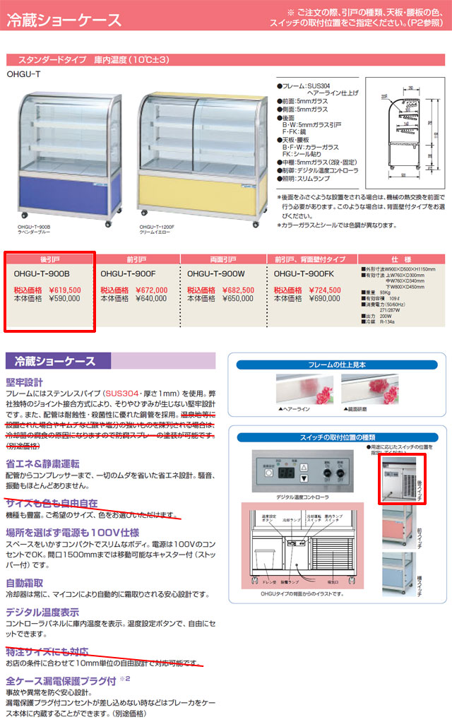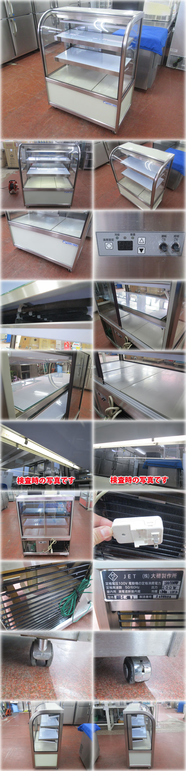 大穂製作所 対面冷蔵ショーケース OHGU-T-900B を出品いたします。 ■特徴■ 堅牢設計 フレームにはステンレスパイプ (SUS304・厚さ1mm)を使用。 弊社独特のジョイント接合方式により、 そりやひずみが生じない堅牢設計です。 また、配管は耐蝕性・殺菌性に優れた銅管を採用。 省エネ&静粛運転 配管からコンプレッサーまで、 一切のムダを省いた省エネ設計。 騒音、振動もほとんどありません。 場所を選ばず電源も100V仕様 スペースをいかすコンパクトでスリムなボディ。 電源は100VのコンセントでOK。 移動可能なキャスター付(ストッパー付)です。 自動霜取 冷却器は常に、マイコンにより 自動的に霜取りされる安心設計です。 デジタル温度表示 コントローラパネルに庫内温度を表示。 温度設定ボタンで、自由にセットできます。 漏電保護プラグ付 事故や異常を防ぐ安心設計。 ■仕様■