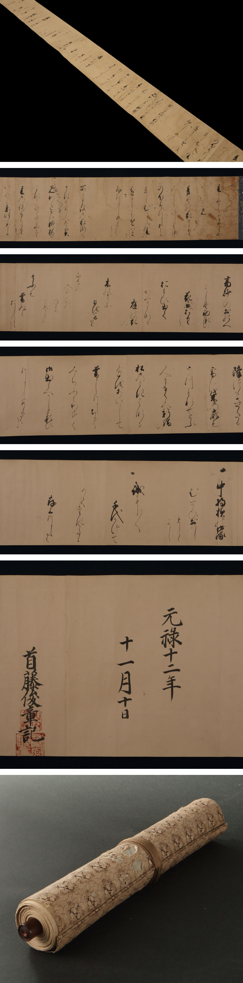 首藤俊章の女筆手本です。 奥女中に向けたとみられる、御家流や和歌の散らし書きを学ぶための書巻です。甲府藩・徳川綱豊(のちの六代将軍家宣)に仕えた、元禄12(1699)年、32歳の書です。 俊章の書流は「首藤流」と呼ばれ、最盛期は諸藩から門人が集いましたが、俊章の没後は振るわず絶家となりました。江戸期の書流を知る上で極めて稀少な逸品です。 ◆首藤俊章 江戸前・中期の書家。通称は又右衛門。号は柏子・巍山。甲府徳川家に仕え、のち六代将軍となった家宣の表右筆となる。「首藤流」を称し、多くの門人を擁した。享保3(1718)年没、51歳。 寸法:縦29cm、横約703cm(最大幅。若干の誤差はご了承下さい) 状態:経年のヤケ・イタミがございます。 |
