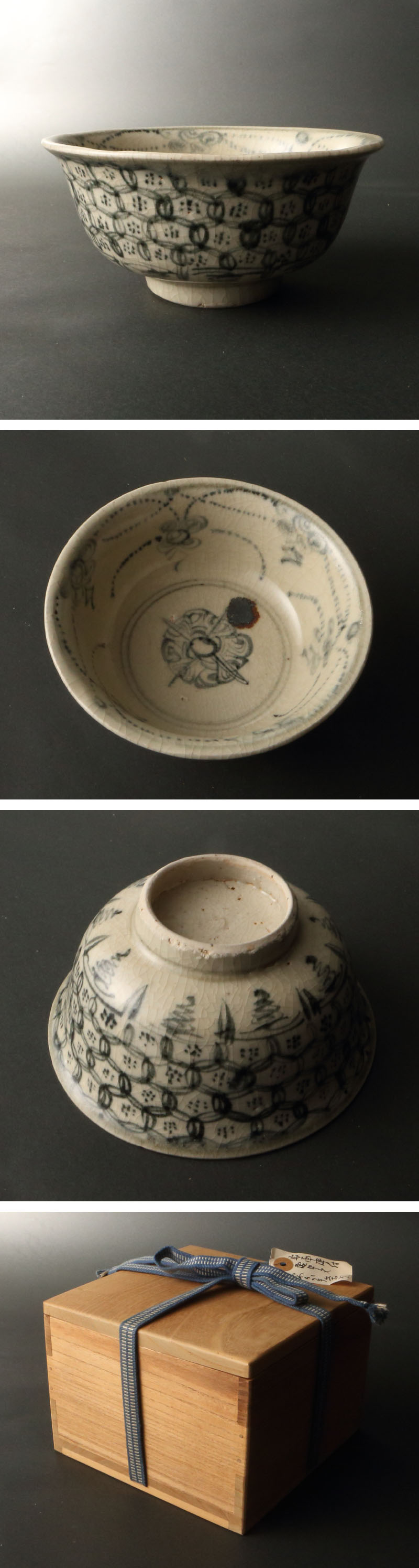 後黎朝の染付碗です。 明代景徳鎮民窯の所謂「亀甲手」と呼ばれる碗を写したものです。絞手の柔和な雅味も加わり、一挙両得といえます。 瓔珞文も丁寧な出来、見込みの呉須溜まりは御愛嬌、さながら別嬪さんの泣き黒子というべき、可憐な逸品です。 付属:時代箱が付属します。 寸法:高さ6.5cm、幅14.5cm(最大幅。若干の誤差はご了承下さい) 状態:経年感、カマキズ、わずかな釉ハゲがございます。 |
