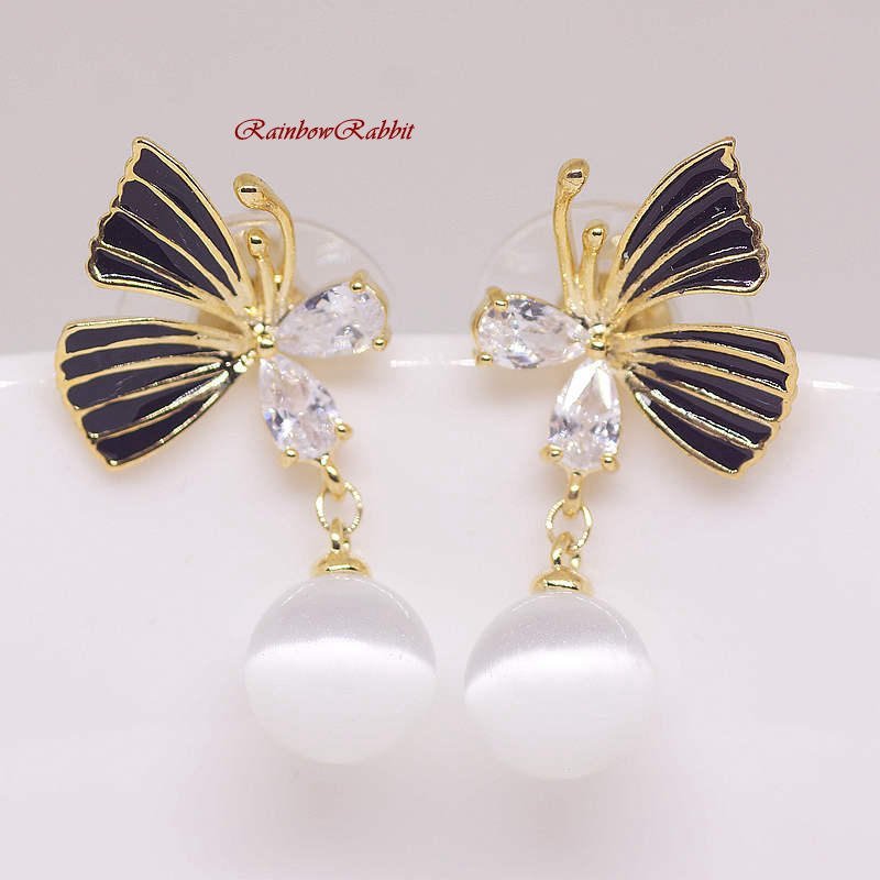 18K RGP ゴールド ダイヤ CZ 蝶々 キャツアイ 揺れ ピアス gp53