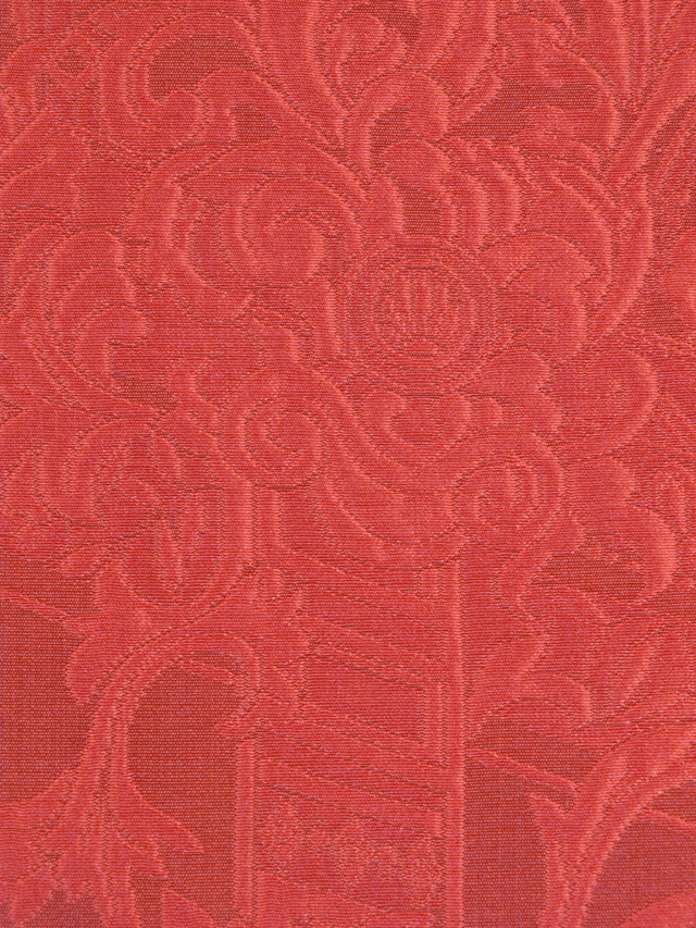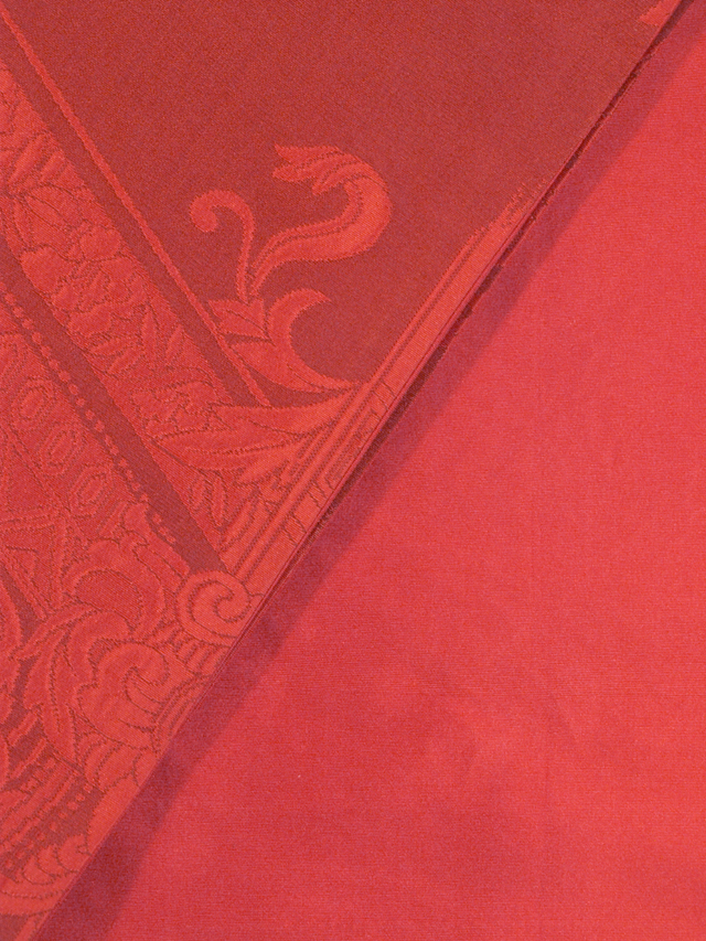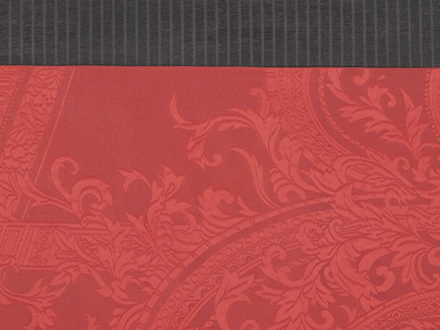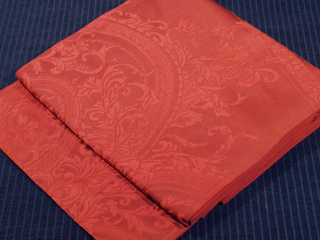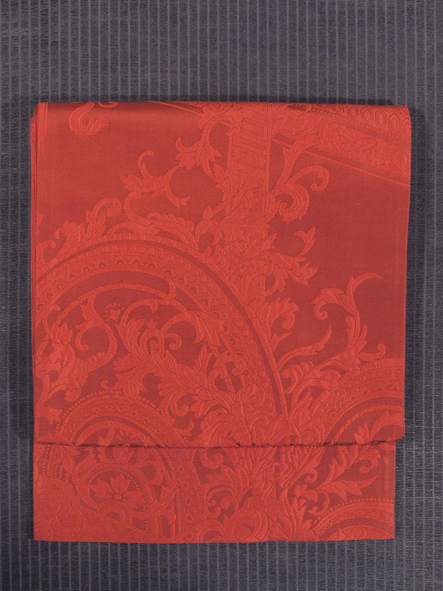 赤紅色の地に門柱と唐草の文様が織り込まれている、西陣織の縮織(ちぢみおり)の洒落袋帯です。 ギリシャの神殿のような門柱に唐草が巻き付いている意匠でオリエンタルな趣が感じられます。優美な雰囲気のお色目で、縮織特有のふくらみがあり、レリーフ(彫刻)のような表情が与えられています。 ユーズド品で、前の折り跡と結びジワがうっすらとあります。こまかなくすみなどはあるかもしれませんが、目につくしみやよごれなどのダメージはなく、きれいな状態です。 |