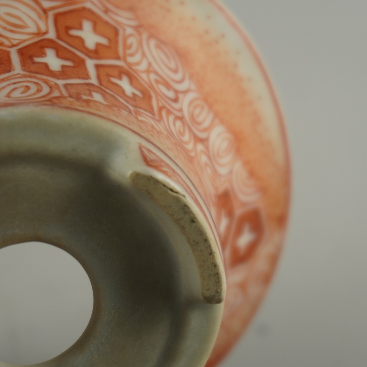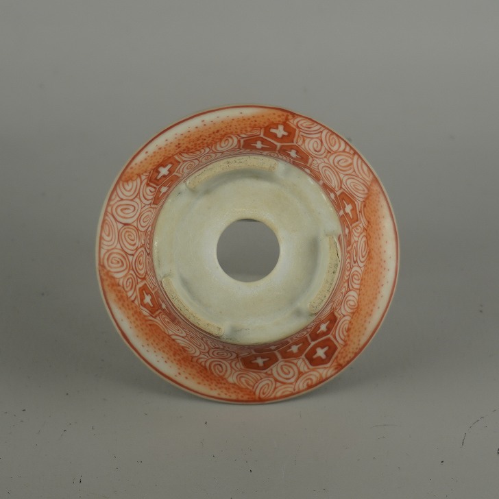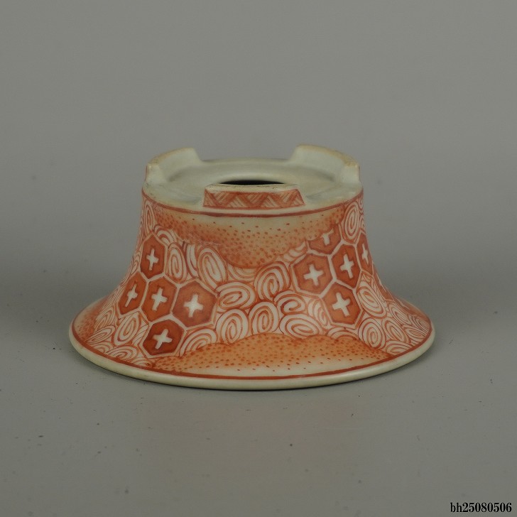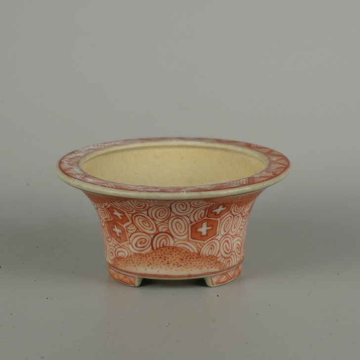 【中古】盆栽鉢 落款なし 小型 長辺 約 10cm 丸鉢 外縁 赤絵 模様 鑑賞 観賞用 現品 中古鉢 收藏