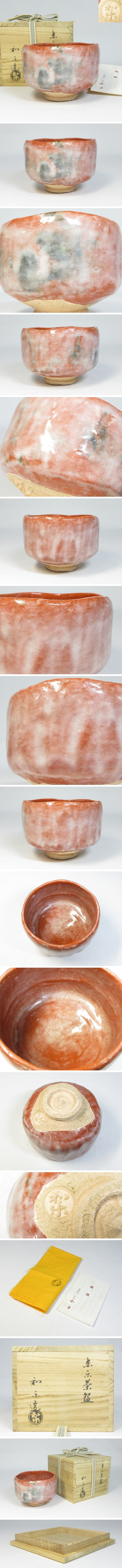 【B0806b】茶道具 京都 楽焼『 川崎和楽 』作 赤楽 抹茶茶碗 四方桟 共箱 共布 栞付き 收藏