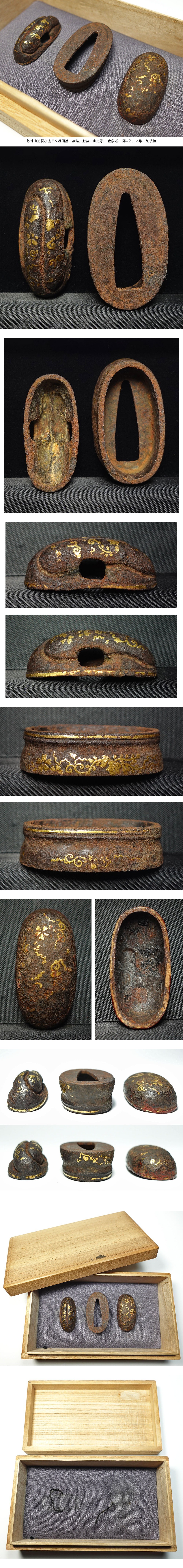 ★本歌 肥後拵 鉄地山道彫 桐桜唐草文 縁頭鐺 こじり 無銘 肥後金工 金象嵌 細川家家紋 桐箱入 細川三斎 貴重品 收藏
