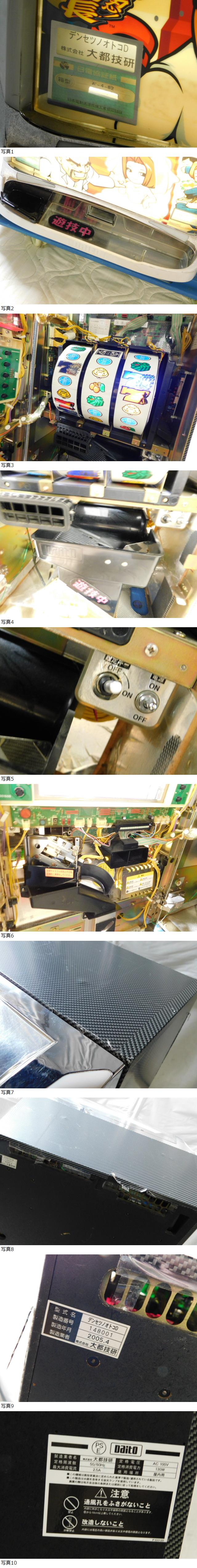 ★コンセントを差して電源が入りランプが点灯することを確認しました。 ★リールが回転して、MAX BET・スタートレバー・ストップボタンを押し、遊べることを確認しました。レバーの反応が鈍い感じがしました。詳しくはわかりません。 ※他の細かい動作の確認はしていません。