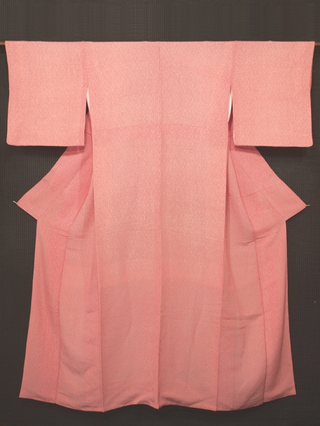 紅赤色の地に鮫の文様が染め抜かれた縮緬の小紋です。袷仕立てです。 パッと明るい感じのかわいらしさのあるお色目です。シャリ感のある、やわらかな、シボの大きな縮緬地です。 ユーズド品で、胴裏の腰下に直径約 3mm の色うつりが 1 か所あります。そのほかに目につくしみやよごれ、褪色などのダメージはなく、きれいな状態です。 |