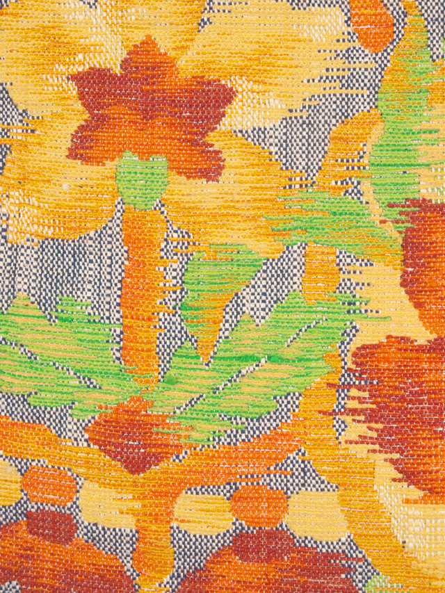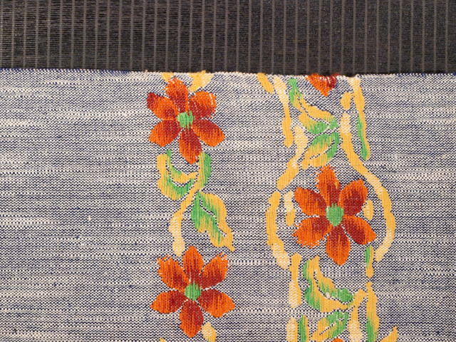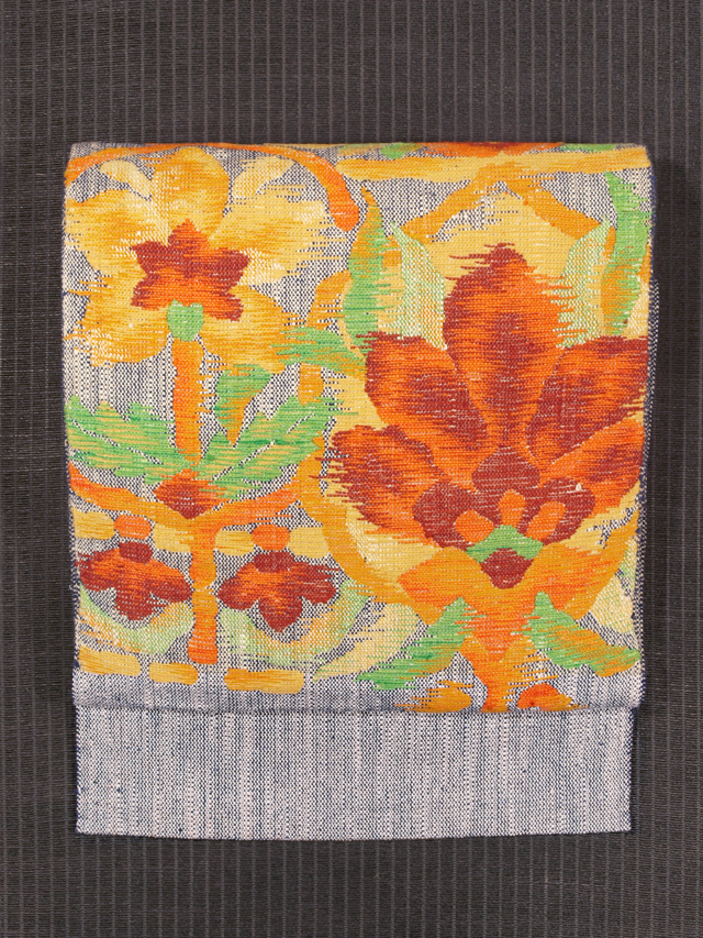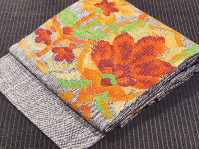 全体的な印象としてはごく淡い紺鼠(こんねず)色といった感じの地に、唐花草の文様が織り込まれている、紬の八寸名古屋帯です。 アンティークに近いお品で、キッチュなお色目の唐花草が情熱的なかわいらしさを醸しています。ざっくりとした手ざわりの手織の地風が良い趣で、色褪せたデニムのような風情が感じられます。 使用感はなく、未使用保管品と思われます。たれの裏にうっすらとした若干のヤケ感が広くあるほか、たれ先の表にも同様のヤケ感がある感じがしますが、あまり判別はつかず、そのほかに目につくしみやよごれ、褪色などのダメージはなく、全体的には良好な状態です。 |