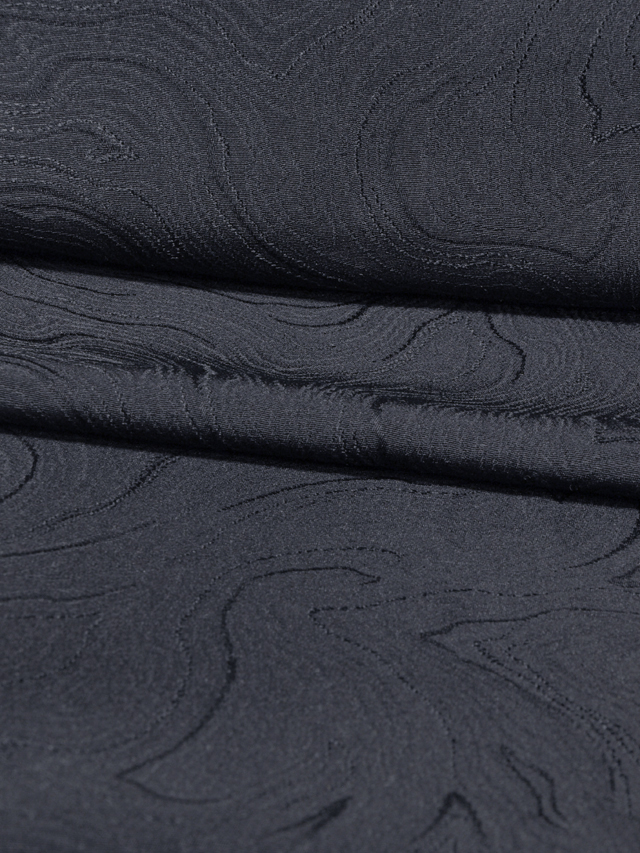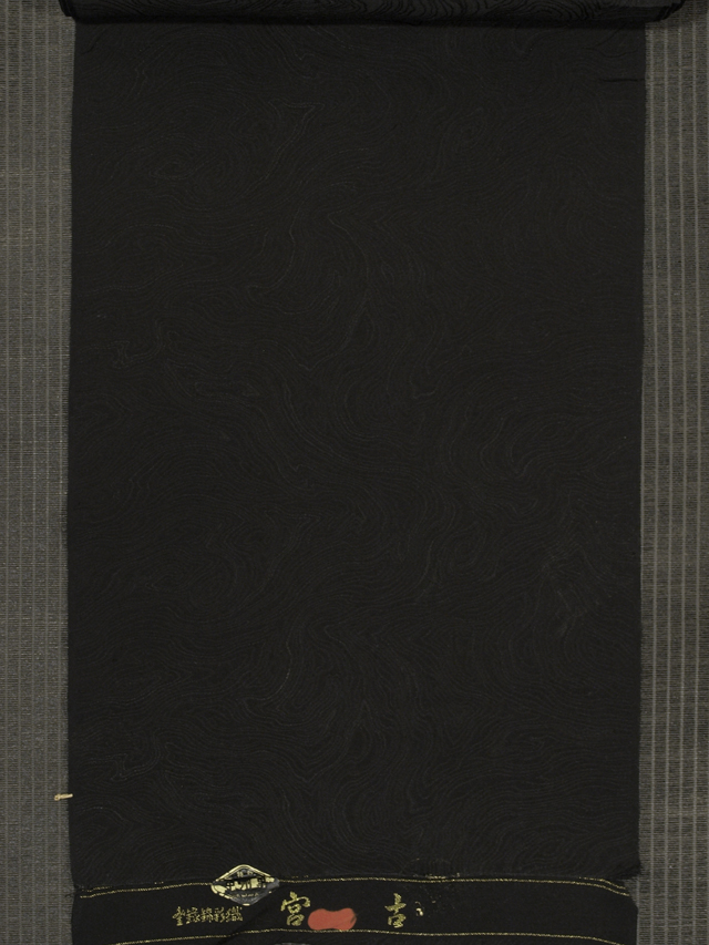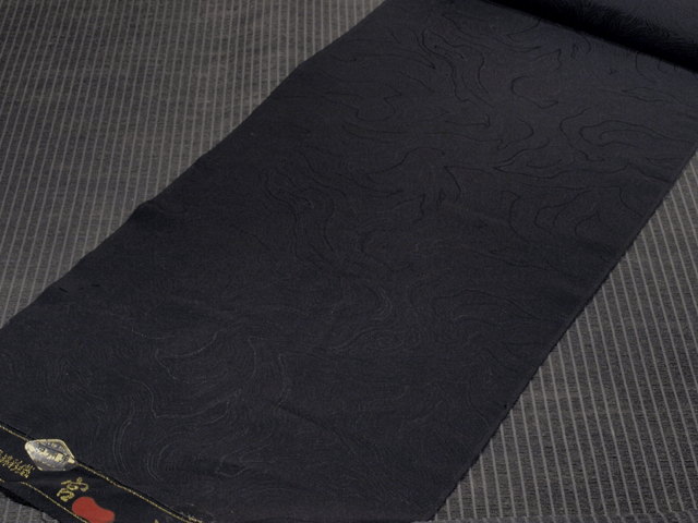 黒色の地に、木目の地紋が織り出されている、駒綸子縮緬の黒色無地の長ささの異なるハギレの 2 枚組です。京都・西京区の染元「京都黒染工業協同組合」さんの製品です。それぞれに染め抜きで「中陰花菱(ちゅうかげはなびし)」の一つ紋が 1 か所あります。 黒色で染める前に紅で下染めして「深みのある黒」をあらわした高品質の色無地のはぎれです。やわらかでハリのある手ざわりの駒綸子地です。 はぎれのため、ユーズド品(古布)としてはいますが、未使用です。しみやよごれ、褪色、穴などのダメージはなく、とてもきれいな状態です。 |