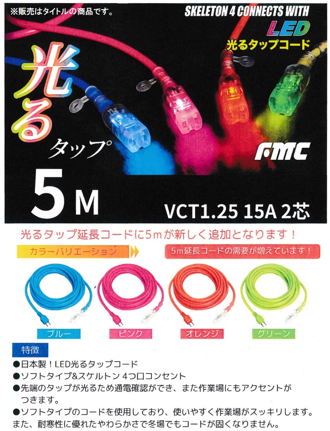フジマック 光るタップコード 5M HE-1505-G グリーン 15A VCT1.25 2芯 HE-1505G 延長コード FUJIMAC 小型便 在庫 收藏