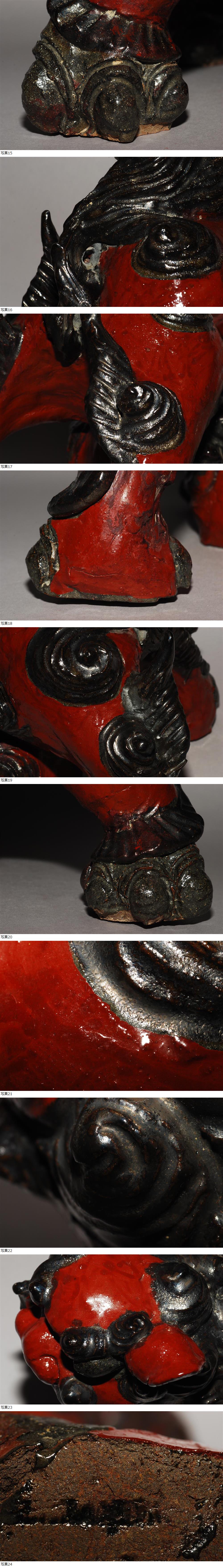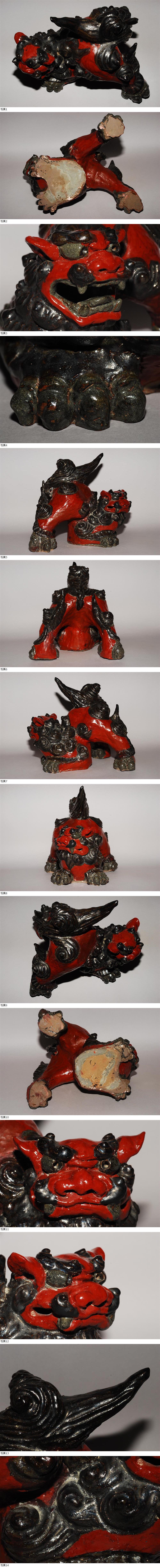 壺屋焼 小橋川清正 造 手びねり 赤絵 シーサー 阿吽一対 高さ:27.5cm 秀逸作 箱なし 狛犬 獅子 壷屋焼 收藏