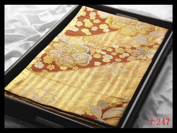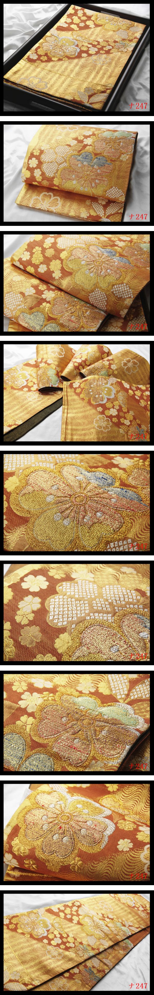 【ナ247】厳選逸品 振袖可 桜散らし紋 樺色地 気品豊かに 正絹純金糸六通高級美術袋帯 検★着物名古屋帯和装小物帯締め 收藏