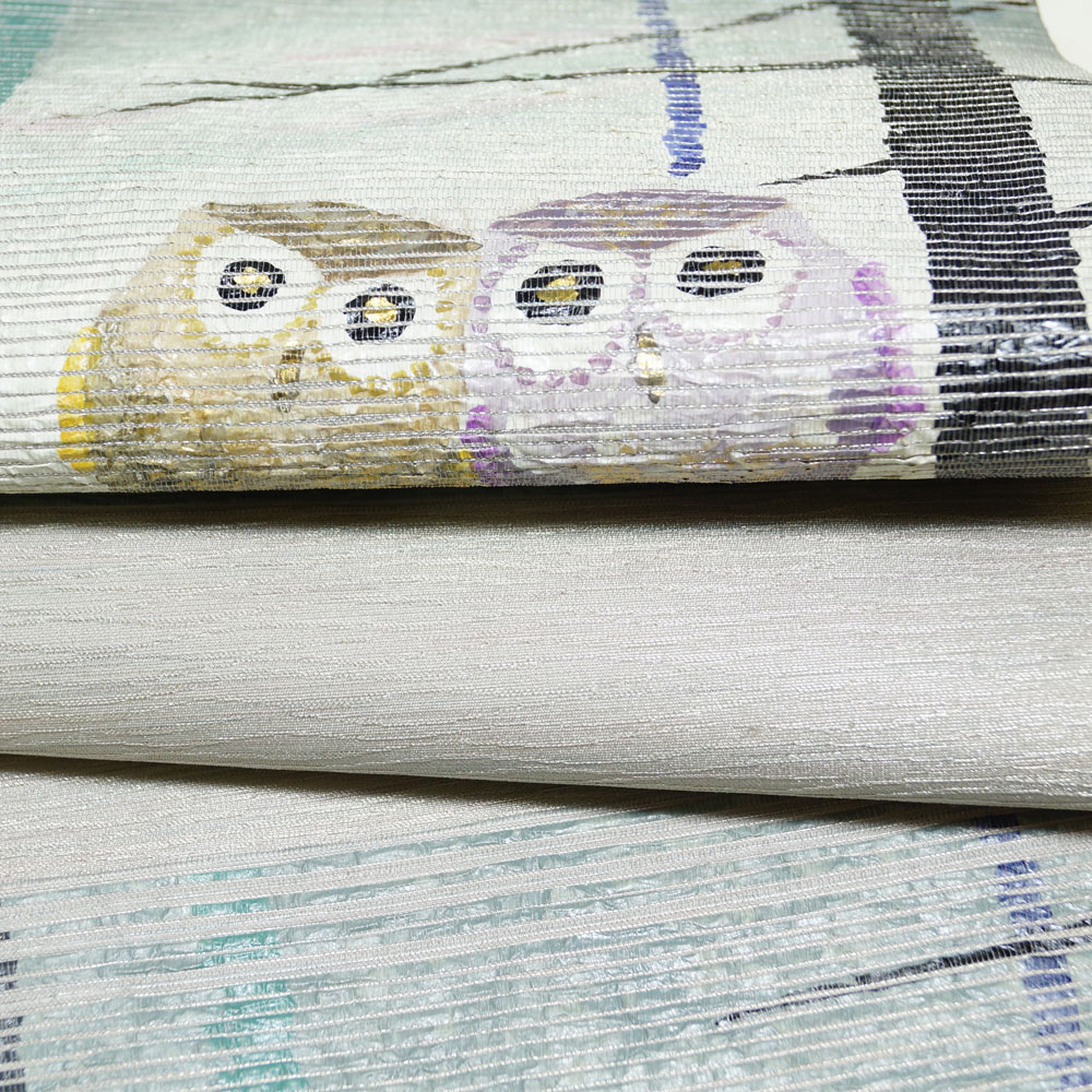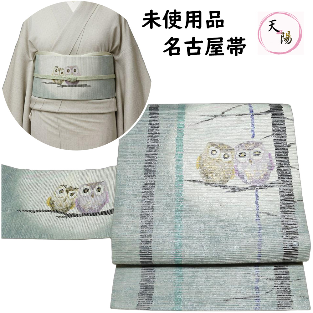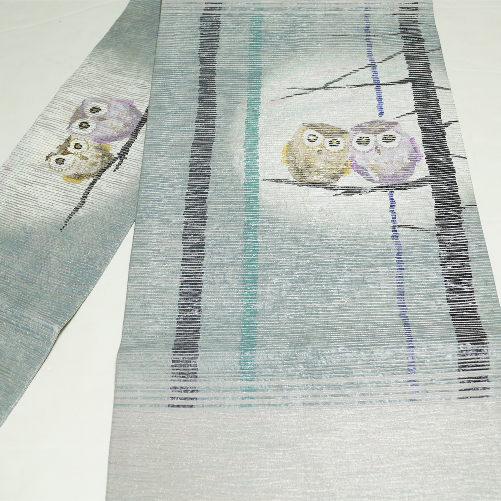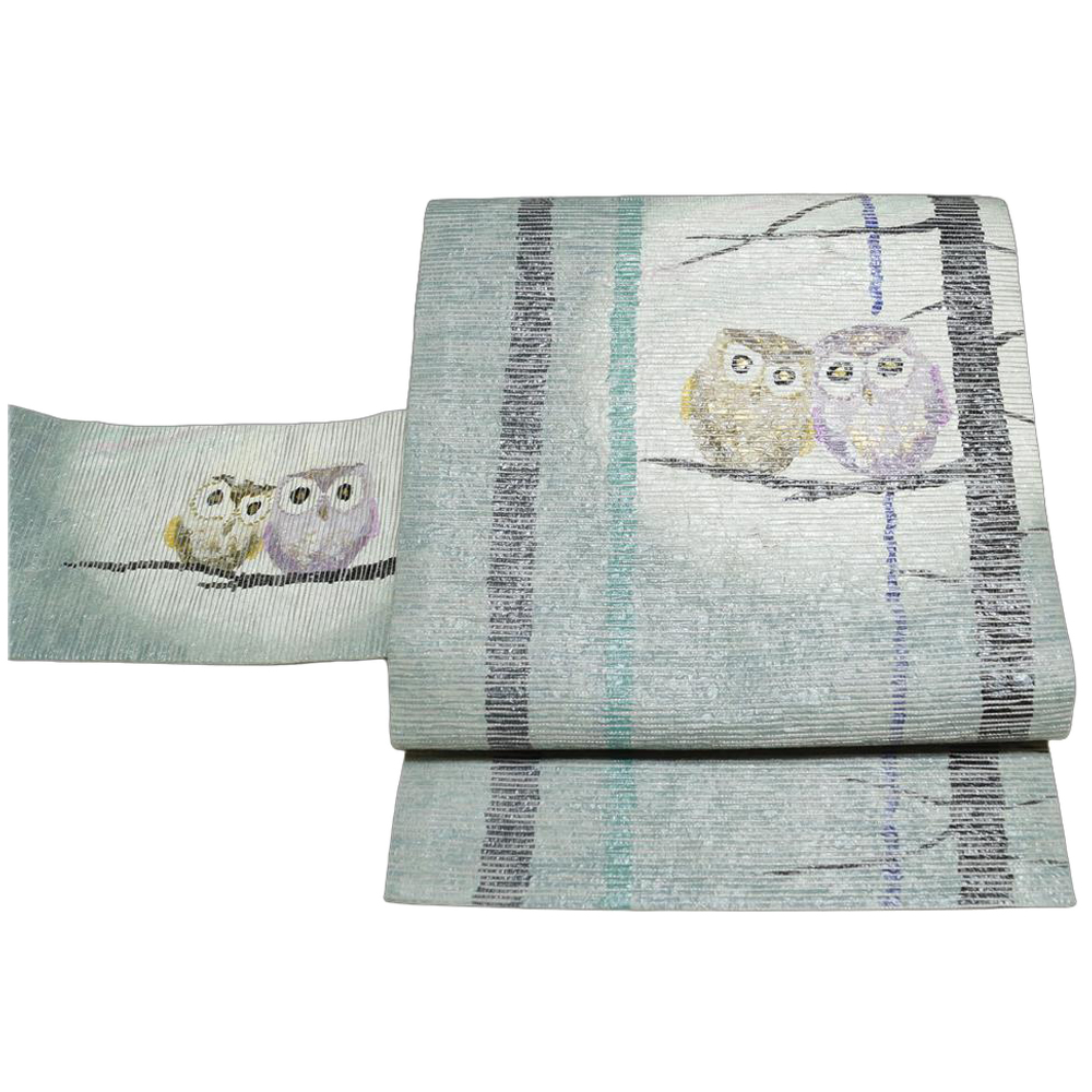 名古屋帯 未使用品 フクロウ模様 お太鼓柄 膨れ織 銀通し 梟 名古屋 帯 中古 なごや帯 リサイクル着物 女性和服 着物 京都きもの天陽 收藏