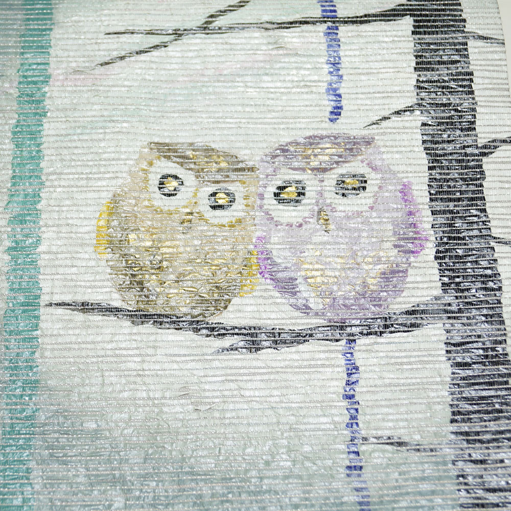 | 商品 説明 | 銀通しの施された白鼠色系の地に木立にフクロウ模様が施された名古屋帯です。お太鼓部・前帯部・手先部分は膨れ織となっており、その他の部分は波線模様の地織が施されております。 |