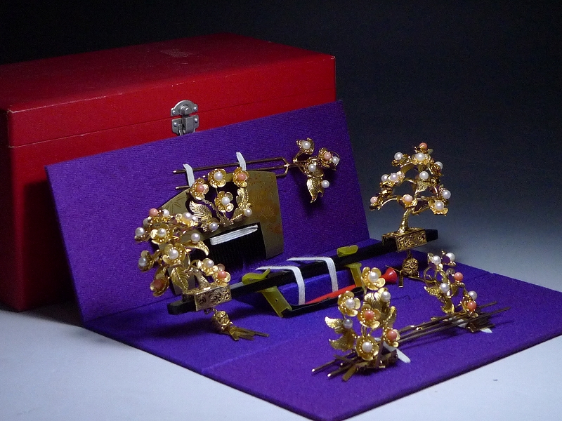 80MK186★秀正造・花嫁簪セット・かんざし 飾り櫛・松 梅 花 葉 パール 珊瑚 金細工・和装小物 髪飾り 日本髪 婚礼 舞妓 收藏