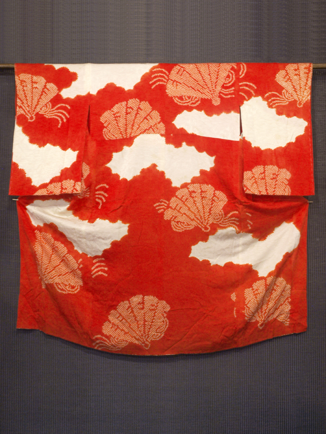 白色の地に波と唐花草の配された雲の地紋が織り出され、緋色の絞り染めで雲と檜扇(ひおうぎ)の文様が施されている駒綸子の長襦袢です。袷仕立てです。 昭和初期ごろにつくられたと思われるアンティークのお品です。大胆な意匠が縁起よく、美しい印象です。 画像のとおり、白色地部分がうっすらと黄変気味なほか、地衿にポツポツと黄変があります。また、下前身ごろの腰付近に直径約 1mm のよごれが 1 か所、左後身ごろの腰下に直径約 1-2cm のうっすらとした色うつりが 2 か所あります。そのほかに目につく大きなしみやよごれ、褪色などのダメージはなく、この時代のものとしては良好な状態なので、アンティークにご理解のある方であればご着用可能ですが、状態ランク=「D」のご着用対象外、リメイク素材用とさせていただきます。 |