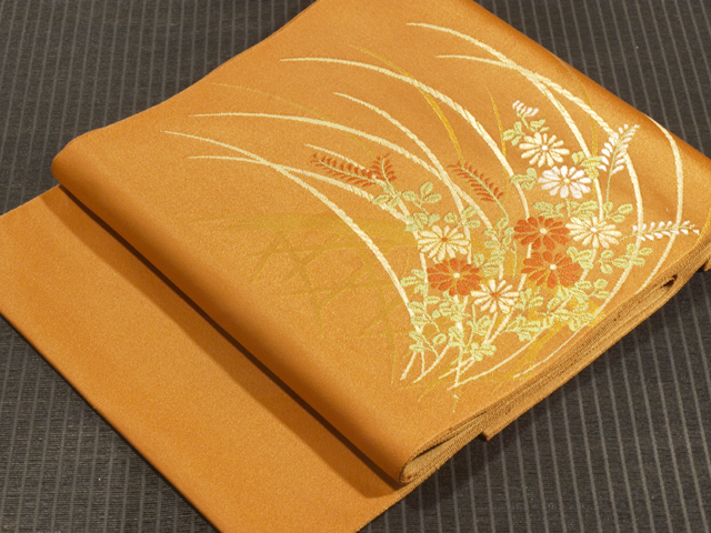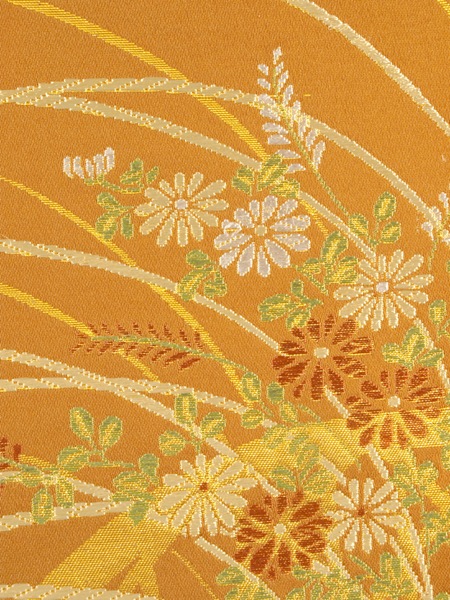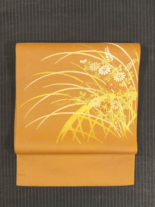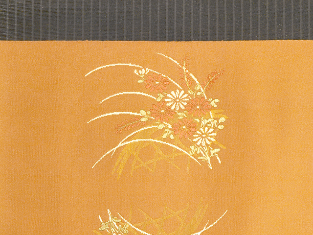 琥珀(こはく)色の地に、垣(かき)と萩(はぎ)と菊、薄(すすき)の文様が織り込まれている、西陣織の八寸名古屋帯です。 落ち着いたわびさびの美しさが感じられる意匠です。化繊地なので、お手入れが気軽にできます。 仕立て上がり未使用保管品で、目につくしみやよごれ、褪色などのダメージはなく、新品同様にきれいな状態です。 |